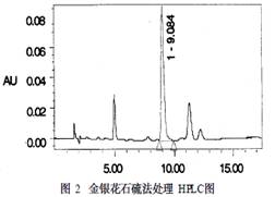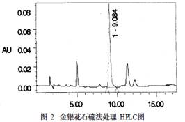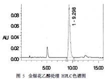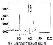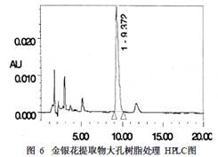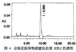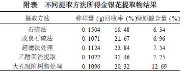 3 討 論 采用乙醇提取、超濾法處理、大孔吸附樹(shù)脂處理、改良石硫法提取方法所得金銀花提取物與原石硫法相比,綠原酸的轉(zhuǎn)移率和含量都有了很大的提高。而采用乙醇提取、超濾法處理、大孔吸附樹(shù)脂3種方法處理的提取物中綠原酸含量提高得更多,但它們的組分均發(fā)生了改變,與原石硫法有差別。液相色譜中,綠原酸色譜峰前,石硫法有的幾個(gè)峰,提取物中有的消失了,有的下降了很多,且藥理作用顯示上述3種提取物的抗菌作用沒(méi)有石硫法強(qiáng)[ 3 ] ,只有采用改良石硫法所得提取物的液相色譜圖與原石硫法組分基本保持一致。由此可見(jiàn),綠原酸含量的高低尚不能說(shuō)明金銀花提取物的質(zhì)量好壞。