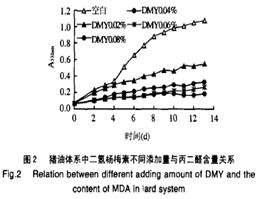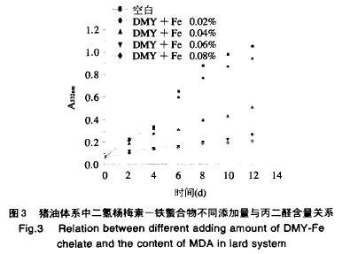 油中丙二醛含量的影響,其關(guān)系如圖2所示。由圖可以看出,70℃恒溫放置13d后, 各處理組的丙二醛生成量隨時間的延長而增加,其中空白組到第5d氧化速度開始加快,而添加二氫楊梅素組都表現(xiàn)出了良好的抗氧化活性, 在貯存第13d,二氫楊梅素添加量0.04%、0.06%、0.08% 組的丙二醛含量比較接近,分別為0.325、0.261、0.1 89,而空白組的丙二醛含量已經(jīng)超過測量范圍,經(jīng)稀釋測定,還原其值為1.045,可見二氫楊梅素具有良好的抗氧化性能。二氫楊梅素分子中具有六個 基, 具有很強(qiáng)的還原供氫能力,可以阻斷氧化過程中游離基鏈?zhǔn)椒磻?yīng)【7】。林淑英在其研究中測定二氫楊梅素在豬油體系中的抗氧化能力,也認(rèn)為二氫楊梅素明顯阻礙油脂體系氧化過程的發(fā)生【8】。 由圖3可以看出,二氫楊梅素一鐵螯合物添加到豬油體系中,其體系的丙二醛含量變化與直接采用二氫楊梅素的情況大致相同,只不過由于鐵在螯合物中要占據(jù)一定的比例,導(dǎo)致實際添加到體系中的二氫楊梅素量減少,所以從圖3反映的情況可以看出, 當(dāng)添)Jn-氫楊梅 素一鐵的螯合物為體系的0.06% 以上時,體系的丙二醛含量增加不顯著,即可以有效的 組織體系氧化的發(fā)生。此試驗結(jié)果也說明,本實驗制各的二氫楊梅素一鐵螫合物對二氫楊梅素的抗氧化活性影響不大。 3 結(jié) 論 以往的研究工作已經(jīng)證明, 二氫楊梅素在天然植物顯齒蛇葡萄中單體含量極高, 同時其具有多種顯著生理功能,所以開發(fā)前景極大【l0】。本研究正是在以往研究工作的基礎(chǔ)上,探討了二氫楊梅素一鐵螯合物的制備及其抗氧化活性測定, 得出如下結(jié)論。 3.1 二氫楊梅素容易與鐵發(fā)生螯合作用,鐵的螯合率較高, 有實際應(yīng)用價值。 3.2 二氫楊梅素與鐵發(fā)生螯合作用后, 對螯合物的抗氧化活性影響不大。 參考文獻(xiàn): [1] 熊皓平,楊偉麗,張友勝,等.天然植物抗氧化劑的研究進(jìn)展[J].天然產(chǎn)物研究與開發(fā),2001,13(5):75.79. [2] 林淑英.顯齒蛇葡萄中二氫楊梅素的提取純化及抗氧化活性研究【D】.華南理工大學(xué)2001級博士畢業(yè)論文,2004,(7):74. [3] 顧維雄.保健食品(第一版)【M】.上海:上海人民出版社,2001.336. [4] 張友勝.類茶植物顯齒蛇葡萄化學(xué)成分的分離鑒定與DMY提制技術(shù)的研究【D】.湖南農(nóng)業(yè)大學(xué)博士學(xué)位論文,2001,(7):35. [5] 陳必友,李啟華.工J‘分析化驗手冊.(第一版)【M】.北京:化學(xué)工業(yè)出版社,2002.9. [6] 楊書珍,張友勝,彭麗桃,等.二氫楊梅樹皮素的抗氧化活性研究【J】.中國糧油學(xué)報,2004,19(2):82—84. [7] 林親錄,施兆鵬.類黃酮與酚酸等天然抗氧化劑的結(jié)構(gòu)與其抗氧化力的關(guān)系【J】.食品科學(xué),2001,22(6):85.91. [8] 林淑英,張友勝,寧正祥,等.顯齒蛇葡萄中二氫楊梅素的提取純化及抗氧化活性研究【J】.食品科技,2003,(4):71.73. [9] 張德聰.結(jié)構(gòu)化學(xué)(第一版)【M】.廣州:華南理工大學(xué)出版社,2000.101.126.130. [10] 馮雷.淺議中藥現(xiàn)代化的必要性與提高中藥質(zhì)量的關(guān)系【J】.中國中醫(yī)藥信息雜志,2003,10(3):1-3.