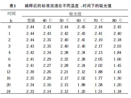 根據(jù)標(biāo)樣的保留時間定性, 按峰面積計算綠原酸含量。 2 結(jié)果與分析 2 .1 溫度對杜仲有效成分綠原酸穩(wěn)定性的影響由表1 可知, 在室溫條件下, 綠原酸隨時間的推移, 分解較緩慢,0 h 時的吸光值為2 .44 ,24 h 后吸光值為2 .33 ,24 h 內(nèi)A 值僅下降0 .11 ; 隨溫度的升高, 綠原酸受熱時間的延長, 其分解也相應(yīng)加快, 在60 ℃時分解較快,0 h 時的吸光值為2 .45 ,24 h 后吸光值為1 .20 ,24 h 內(nèi)吸光值下降了1 .25 ; 而在80 ℃時0 h 時吸光值為2 .45 ,24 h 后吸光值為1 .18 , 下降了1 .27 。
