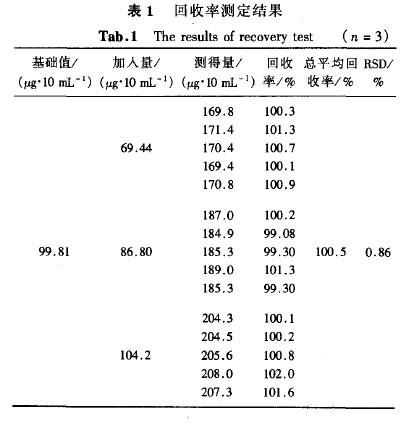 黃喜茹 ,曹冬,高潔,張雪,付超美 (河北醫(yī)科大學(xué)藥學(xué)院,河北石家莊050017) 摘要:建立測(cè)定鼻炎滴劑中綠原酸含量的方法。利用RP-HPLC法,采用Diamonsil (鉆石)cl8色譜柱(250 mm×4.6 mm, 5 m),以甲醇一水一冰醋酸(25:75:1)為流動(dòng)相,流速1.0 mlMmin,檢測(cè)波長(zhǎng)328 nm,用RP.HPLC法測(cè)定金銀花的活性成分 綠原酸,在4、34 30.38 g/mL范圍內(nèi)與峰面積呈良好線性關(guān)系,回歸方程為:A:263 232c+120 130,相關(guān)系數(shù)r= 0.999 5。綠原酸的平均回收率100.5%(RSD=0.86% ,n=3)。方法簡(jiǎn)便、快速,被測(cè)組分與其他組分色譜峰分離良好。 關(guān)鍵詞:鼻炎滴劑;綠原酸;反相高效液相色譜法 鼻炎滴劑是中西復(fù)方溶液制劑(噴霧劑),主要成分為金銀花提取液、辛夷油、冰片、黃芩苷、鹽酸麻黃堿等,具有散風(fēng)、清熱、通竅之功能,臨床用于風(fēng)熱蘊(yùn)肺型急慢性鼻炎。鼻炎滴劑的質(zhì)量控制方法,已報(bào)道有用高效液相色譜法測(cè)定其中鹽酸麻黃堿的含量ll J,還有以黃芩苷為質(zhì)控指標(biāo)的分光光度法l2 J,但以投藥量較大的金銀花的有效成分綠原酸作為質(zhì)量控制指標(biāo)的方法目前還未見(jiàn)報(bào)道。本文參考文獻(xiàn)[3-6],研究建立了測(cè)定鼻炎滴劑中綠原酸含量的反相高效液相色譜法,對(duì)控制鼻炎滴劑的質(zhì)量具有一定意義。 1 實(shí)驗(yàn)部分 1.1 主要儀器與試劑 美國(guó)Waters高效液相色譜儀:510泵,2487紫外檢測(cè)器,N2000雙通道色譜工作站(浙江大學(xué)智能信息研究所);JA1203A型電子天平(上海精密科學(xué)儀器有限公司);TCQ.250超聲波清洗器(北京醫(yī)療設(shè)備二廠);瘜W(xué)對(duì)照品:綠原酸(中國(guó)藥品生物制品檢定所,供含量測(cè)定用,批號(hào):110753.200212)。供試品:鼻炎滴劑(市售規(guī)格:10 mlM瓶,廣東佛山德眾藥業(yè)有限公司:批號(hào)06001;06012)。試劑:甲醇(進(jìn)口色譜純),冰醋酸(分析純),重蒸水(自制)。 1.2 實(shí)驗(yàn)方法 1.2.1 色譜條件 色譜柱:DiamonsilTM(鉆石)C18(250 mm×4.6mm,5 m);流動(dòng)相:甲醇 水.冰醋酸(25:75:1);流速:1.0 mlMmin;柱溫:30 oC;檢測(cè)波長(zhǎng):328 nm;進(jìn)樣量20ul。 1.2.2 對(duì)照品溶液制備 精密稱(chēng)取綠原酸對(duì)照品2.17 mg,加50% 甲醇制成綠原酸濃度為86.80 t~g/mL的對(duì)照品溶液。 1.2.3 供試品溶液的制備 精密量取2.0 mL鼻炎滴劑置于25 mL容量瓶中,加50% 甲醇稀釋到刻度,搖勻,用0.45肚m微孑L濾膜過(guò)濾,取續(xù)濾液,即得供試品溶液。 1.2.4 系統(tǒng)適用性實(shí)驗(yàn) 在上述色譜條件下,綠原酸的色譜峰與相鄰峰的分離度>1.7,理論塔板數(shù)/7,>5 000。經(jīng)紫外檢測(cè)器檢測(cè),供試品中綠原酸的保留時(shí)間與對(duì)照品一致(見(jiàn)色譜圖1)。 1.2.5 標(biāo)準(zhǔn)曲線的制備 精密量取對(duì)照品溶液,加50%甲醇制成綠原酸濃度分別為4.34、8.68、13.02、17.36、21.70、26.04、30.38~g/mL的對(duì)照品溶液。按上述色譜條件,進(jìn)樣20 L,記錄色譜峰面積。以峰面積A對(duì)濃度c(~g/mL)進(jìn)行線性回歸,求得回歸方程。結(jié)果是綠原酸的線性范圍為4.34~30.38 btg/mL,回歸方程A=263 232c+120 130,r=0.999 5。 1.2.6 精密度試驗(yàn) 按上述色譜條件,各取線性關(guān)系項(xiàng)下對(duì)照品溶液20ul ,注入高效液相色譜儀,連續(xù)進(jìn)樣5次, 記錄色譜圖,結(jié)果綠原酸峰面積日內(nèi)RSD 為0.81% 。 1.2.7 空白試驗(yàn) 按處方和工藝自配不含金銀花的空白制劑,再按供試品溶液的制備方法制備并測(cè)定。結(jié)果空白溶液在綠原酸對(duì)照品相同保留時(shí)間處未出現(xiàn)色譜峰,故認(rèn)為無(wú)干擾。 1.2.8 穩(wěn)定性和重現(xiàn)性試驗(yàn) 取同一供試品溶液,在0、2、4、6、8、10 h分別一進(jìn)樣20ul ,記錄峰面積,結(jié)果6次進(jìn)樣綠原酸的峰面積RSD為1.1%。取同一批號(hào)樣品溶液(06001),按供試品溶液制備方法制備5份供試品 溶液,各進(jìn)樣20 ,測(cè)得綠原酸的平均含量為249.5~g/mL(RSD=1.2%)。 1.2.9 加樣回收率試驗(yàn) 精密量取5.0 mL供試品溶液,加50% 甲醇制成10.0 mL,在上述色譜條件下,進(jìn)樣20ul ,測(cè)出綠原酸的含量,取5次測(cè)定的平均值作為基礎(chǔ)值。 精密量取相同體積的供試品溶液3份,分別加入0.8、1.0和1.2 mL綠原酸對(duì)照品溶液,加50% 甲醇制成10.0 mL,在上述色譜條件下,進(jìn)樣20ul,測(cè)出綠原酸的總量,按標(biāo)準(zhǔn)加入法計(jì)算回收率,結(jié)果見(jiàn)表1。 2 樣品的測(cè)定 取一種濃度的被測(cè)組分的對(duì)照溶液20uL進(jìn)樣,取峰面積的平均值,與試樣液在相同條件下進(jìn)樣所得峰面積用外標(biāo)一點(diǎn)法計(jì)算含量,結(jié)果見(jiàn)表2。 3 討論 文獻(xiàn)報(bào)道測(cè)定金銀花及其制劑中綠原酸含量的方法很多,主要為高效液相色譜法 3 ]。按參考文獻(xiàn)的方法或條件試驗(yàn),綠原酸分離效果不理想,經(jīng)試驗(yàn)最終選定甲醇.水冰醋酸(25:75:1)為流動(dòng)相,色譜峰得到了很好分離。反相高效液相色譜法測(cè)定鼻炎滴劑中綠原酸的含量。此法專(zhuān)屬性好,靈敏度高,操作簡(jiǎn)便、易行,結(jié)果準(zhǔn)確可靠,對(duì)鼻炎滴劑的質(zhì)量控制有一定意義。 參考文獻(xiàn): [1]劉貴中.鼻炎滴劑中鹽酸麻黃堿的含量測(cè)定[J].中藥材,1998,21(4):205.206. [2]陳小堅(jiān),崔方祥.轱60.y射線輻照滅菌對(duì)鼻炎滴劑(噴霧型)中黃