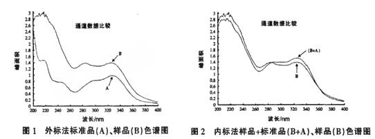 1.3數(shù)據(jù)處理方法利用Microsofter officer Excel求標(biāo)準(zhǔn)曲線及其標(biāo)準(zhǔn)方程.對(duì)重復(fù)數(shù)據(jù)進(jìn)行t檢驗(yàn)或F檢驗(yàn)。 2結(jié)果與分析 2.1 綠原酸最大吸收波長本實(shí)驗(yàn)掃描獲得的綠原酸最大吸收峰波長為327 am,與《中國獸藥典》(2005)報(bào)道一致。 2.2定性分析結(jié)果 2.2.1 UV分析結(jié)果外標(biāo)法測定結(jié)果見圖1,箭頭所指為樣品與標(biāo)準(zhǔn)品在同一波長下具有相似吸收峰的位置。內(nèi)標(biāo)法分析結(jié)果見圖2,箭頭所指為樣品與添加標(biāo)準(zhǔn)品發(fā)生變化的位置,通過UV圖譜可以認(rèn)為銀翹天甘復(fù)方中含有綠原酸。