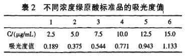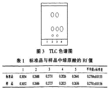 2.2.2 TLC分析結(jié)果由于綠原酸在345 am紫外光照射下會(huì)發(fā)出藍(lán)色熒光。鉛筆標(biāo)記結(jié)果見圖3,由此可知樣品中含有綠原酸。在色譜圖3中1為陰性對(duì)照,2、3為樣品,4為綠原酸對(duì)照品。樣品、標(biāo)準(zhǔn)品的Rf值見表l,二者之間無顯著差異。 2.3定量分析結(jié)果分別在327 nm處測的不同濃度綠原酸標(biāo)準(zhǔn)品的吸光度值,結(jié)果見表2。線性回歸方程為A=0.1897C-0.0033,r=O.9997(n=5)。將樣品稀釋成0.18 mg/mL,測得其吸光度值為0.661(n=5),代入標(biāo)準(zhǔn)曲線方程中即得檢測樣品中綠原酸含量為3.5ug/ml。由此可知銀翹天苷復(fù)方制劑中含綠原酸為1.94%。