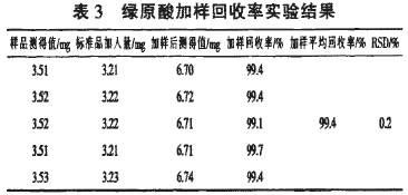2.4加樣璃牧率實(shí)驗(yàn)結(jié)果綠原酸UV法燕樣回收率試驗(yàn)結(jié)果見表3。加樣平均網(wǎng)收率為99.4%,RSD為0.2%。