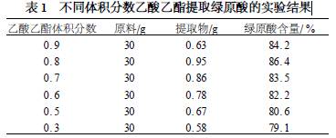 綠原酸除醫(yī)用外,還廣泛用于食品保鮮劑和化妝品的抗衰老劑。具有十分廣闊的應(yīng)用前景[4 ,5 ] 。因而許多研究者對提取綠原酸產(chǎn)生極大興趣,目前,國內(nèi)報(bào)道綠原酸的提取工藝主要有稀醇法、水浸醇沉法和水提法等方法,這些提取方法得到的綠原酸純度低[6 ,7 ] ,要得到較純的樣品還需要進(jìn)行提純,如乙酸乙酯萃取提純法[8 ] 。提取周期長、溶劑用量大、成本偏高。鑒于以上原因,筆者在前人研究的基礎(chǔ)上,探討了乙酸乙酯一步法從金銀花中提取綠原酸, 簡化了提取工藝,并且提高了提取物中綠原酸的相 對含量,是一項(xiàng)具有實(shí)用價(jià)值的方法。 1 實(shí)驗(yàn)部分 1. 1 材料與儀器 金銀花購于衡陽市敬一堂大藥房中藥部;甲醇、乙酸乙酯、鹽酸(用蒸餾水配成0. 05 molPL 的稀溶液備用) 均為分析純試劑(上;瘜W(xué)試劑公司) ;試驗(yàn)菌種(大腸桿菌、金黃色葡萄球菌) 由南華大學(xué)附屬第二醫(yī)院提供,濃度為5000 萬個PmL ,經(jīng)稀釋后為10 萬個PmL 備用。UV22501 型紫外分光度計(jì)(日本島津) ;PR252AA旋轉(zhuǎn)蒸發(fā)器(上海亞榮生化儀器廠) ;恒溫水浴(河南英谷恒溫器廠) ;回流提取器(自組裝) 。 1. 2 實(shí)驗(yàn)方法 1. 2. 1 綠原酸的提取 綠原酸是一種有機(jī)弱酸,在低酸度溶液中其電離過程被抑制,主要以分子形式存在,有利于用乙酸乙酯進(jìn)行液2液萃取[9] 。本工作用乙酸乙酯和稀鹽酸混合溶液作提取劑,從金銀花中提取綠原酸,水是綠原酸溶出劑,鹽酸是電離抑制劑,乙酸乙酯是萃取劑。稱取30 g 金銀花(研成粉末) ,加入240 mL 乙酸乙酯和60 mL 0. 05 molPL 鹽酸,在65°C水浴上攪拌回流浸取3 h ,重復(fù)提取2 次(重復(fù)提取實(shí)驗(yàn)鹽酸用量每次遞減20 mL) ,趁熱過濾,合并濾液分離出乙酸乙酯,用水洗滌,減壓回收溶劑濃縮得到膏狀物,用蒸餾水溶解膏狀物過濾除雜,濾液在水浴上緩慢蒸發(fā)至干,真空干燥至恒重。 1. 2. 2 綠原酸質(zhì)量分?jǐn)?shù)測定 采用分光光度法測定提取物中綠原酸的質(zhì)量分?jǐn)?shù),準(zhǔn)確稱取40 mg 提取物,用甲醇溶解,在100 mL容量瓶中定容,經(jīng)過適當(dāng)稀釋,以甲醇作參比,用分光光度計(jì),在324 nm 下測定溶液的吸光度,將吸光度值代入文獻(xiàn)[8 ]綠原酸標(biāo)準(zhǔn)樣品吸光度曲線方程中,計(jì)算提取物中綠原酸的質(zhì)量分?jǐn)?shù)。 2 結(jié)果與討論 2. 1 乙酸乙酯體積分?jǐn)?shù)對提取綠原酸的影響在乙酸乙酯一步法中,酯是萃取劑,鹽酸水溶液是浸取劑,乙酸乙酯與稀鹽酸的體積比對提取綠原酸有較大的影響,實(shí)驗(yàn)結(jié)果見表1。
