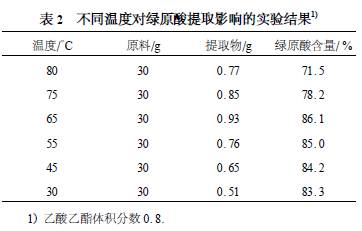 從表1 結(jié)果可見:乙酸乙酯體積分?jǐn)?shù)較高時(shí),水所占比例少不利于金銀花的溶脹,綠原酸難以浸入液相,提取物的質(zhì)量減少,提取率下降,反之,鹽酸水溶液體積分?jǐn)?shù)高時(shí),浸取雜質(zhì)的種類及含量都增加,造成分離過程綠原酸損失大,得率降低,根據(jù)實(shí)驗(yàn)綜合效果乙酸乙酯體積分?jǐn)?shù)為0. 8 時(shí)比較理想,提取物與金銀花的質(zhì)量比為3. 17 % ,綠原酸的質(zhì)量分?jǐn)?shù) 86. 4 %。 2. 2 溫度對提取綠原酸的影響 綠原酸易溶于水,但當(dāng)溫度降低時(shí),溶解性變差,所以溫度太低不利綠原酸的溶出,但溫度過高時(shí),會導(dǎo)致綠原酸分解,不同溫度對提取綠原酸影響的實(shí)驗(yàn)結(jié)果見表2。