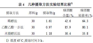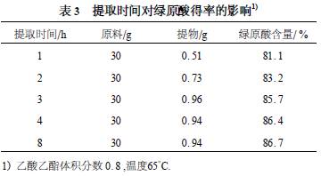 2. 3 綠原酸得率與提取時(shí)間的關(guān)系 在乙酸乙酯一步法提取綠原酸過程中,存在溶解和萃取平衡,提取時(shí)間太短,溶解和萃取均未達(dá)到平衡,綠原酸得率低。提取時(shí)間過長,提取率幾乎不再增加,實(shí)驗(yàn)結(jié)果見表3。