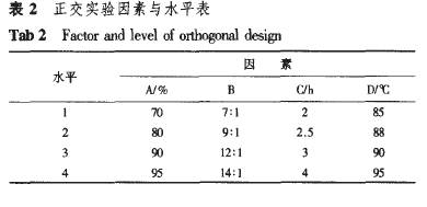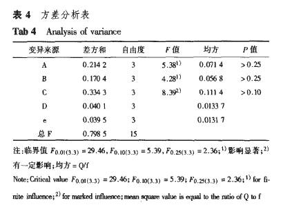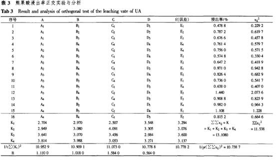 Err 8100 HPLC.pump(Biotronik);BT 8200 HPLC Uv/ⅥS Detector(Biotronik);C.R3A Chromatopac(Biotronik)。 2方法 2.1標(biāo)準(zhǔn)溶液的配制 準(zhǔn)確稱取熊果酸標(biāo)準(zhǔn)品,用甲醇溶解后配制成濃度為0.804 0 mg·mL~,作為測定樣品的標(biāo)準(zhǔn)溶液。 2.2色譜條件 Hypersil C18色譜柱(10 gm,250 toni×4.6 mm),流動相:甲醇.水.乙酸(90:10:0.02),微濾膜過濾流動相后,超聲波脫氣處理20 min;檢測波長220 nm;靈敏度0.08AUFS;流速0.6 mL·min~;溫度為25℃。 2.3標(biāo)準(zhǔn)曲線的繪制 準(zhǔn)確移取0.804 0 mg·mL“的熊果酸標(biāo)準(zhǔn)溶液0,2.0,4.0,6.0,8.0和10.0 mL,甲醇定容至10 mL,配制成標(biāo)準(zhǔn)系列。在“2.2”項色譜條件下,吸取上述溶液,分別進(jìn)樣6血,每一個濃度重復(fù)測定6次。以濃度C(mg·mL。)為橫坐標(biāo),峰面積A為縱坐標(biāo)進(jìn)行線性回歸,得到如下回歸方程:A=524 170c~902.5,R2=0.999 8。 2.4樣品的測定 樣品在與標(biāo)準(zhǔn)曲線相同的色譜條件下測定,根據(jù)回歸方程得到樣品中熊果酸的濃度。 2.5檢測樣品的制備 將分步洗脫得到的洗脫液減壓濃縮至干,甲醇溶解,稀釋定容至10 mL,按“2.4”項下檢測,外標(biāo)法定量。 2.6大孔吸附樹脂的預(yù)處理 先用乙醇充分浸泡溶漲大孔吸附樹脂,然后以蒸餾水洗至無混濁現(xiàn)象,再用4%HCI浸泡,蒸餾水洗至無Q~存在為止。在50℃真空干燥1 d,備用。 3結(jié)果與討論 3.1正交實驗 根據(jù)單因素實驗結(jié)果"1得出:乙醇體積分?jǐn)?shù)(A)、液固比(B)、提取時間(c)和提取次數(shù)都不同程度地影響著熊果酸的浸出率。當(dāng)提取次數(shù)達(dá)到3次后,浸出率變化不大。而且在實際生產(chǎn)中也不可能進(jìn)行多次提取,因此選擇的回流提取次數(shù)為2次。不同的水浴溫度(D)可以使提取液的回流速度不同,從而影響浸出率。因此正交實驗以乙醇體積分?jǐn)?shù)、液固比、提取時間和提取溫度4因素確定[8],正交實驗因素與水平選擇見表2,熊果酸浸出率的正交實驗及計算結(jié)果見表3。方差分析見表4。