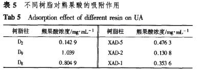 從表3,4可知,提取時間顯著影響熊果酸的浸出率,乙醇體積數(shù)和液固比對浸出率有一定的影響,提取溫度在85~95℃范圍內(nèi)對浸出率沒有明顯影響。由正交實驗結(jié)果可以得到最佳提取條件為A3&C2 Dl,即乙醇體積分?jǐn)?shù)為90%,液固比為14.回流時間為2.5 h,回流溫度為85℃。在該條件下,熊果酸的浸出率可達(dá)到1.44%。 3.2熊果酸的富集 “3.1”項下苦丁茶提取液用20%NaOH調(diào)節(jié)溶液的pH=9~11,除去大分子雜質(zhì),所得濾液用10%颶s04酸化至pH=1。2,過濾所得沉淀,水洗至近中性,50℃真空干燥,得到熊果酸富集物。、采用“2.4”項下方法分析其中的熊果酸純度為28.05%。 3.3大孔吸附樹脂對熊果酸吸附性能的研究 3.3.1大孔吸附樹脂對熊果酸的靜態(tài)吸附性能分別稱取6種大孔吸附樹脂8 g,按“2.6”項下方法對樹脂進(jìn)行預(yù)處理,濕法裝柱。甲醇溶解熊果酸富集物,濃度為1.3l mg·ml-1,再用極性調(diào)節(jié)劑以1:1稀釋后上柱,靜態(tài)吸附1 h后,先以H20洗至無色,再以90%乙醇洗脫至無三萜反應(yīng)[9],按“2.5”項下方法處理洗脫液,結(jié)果見表5。