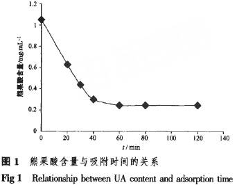 從表5可知,D8,聵樹脂對熊果酸的吸附量較高,而XAI)-2樹脂最低,但試驗表明:XAD-2樹脂吸附雜質(zhì)的能力很強,而XAD-5,XAD-I樹脂對熊果酸的吸附能力較強,90%乙醇洗脫時很難使熊果酸解吸完全,洗脫速度明顯比其它4種樹脂慢。因此,選擇聵,馬樹脂富集熊果酸,XAD-2樹脂純化熊果酸進(jìn)行研究。從幾種樹脂的主要技術(shù)參數(shù)分析,粒徑為0.6~1.42 mm的樹脂適合于富集熊果酸,而粒徑為0.35~1.30 mm的樹脂不適合于富集熊果酸。 3.3.2洗脫劑種類的選擇根據(jù)綠色清潔工藝的要求,采用乙醇.水體系為洗脫劑不僅避免了以往硅膠柱色譜富集熊果酸時有毒有機溶劑的使用,而且乙醇回收后可以重復(fù)使用,降低了生產(chǎn)成本,為產(chǎn)品的產(chǎn)業(yè)化開發(fā)提供了保證。因此,本研究選用乙醇一水為洗脫劑。 3.3.3吸附時間的確定精確稱取經(jīng)預(yù)處理活化的D8大孔 吸附樹脂1.000 g于100 mL燒杯中,以熊果酸含量為1.05mg·mL。1的樣品30 mL加入到燒杯中,吸附20,30,45,60,90和120 min后依次取樣,按“2.4”項下分析方法檢測,結(jié)果見圖1。