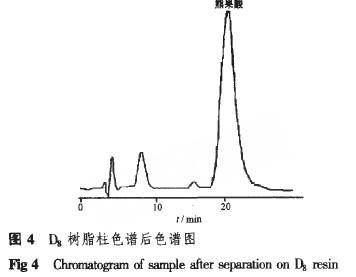 由圖3可知,洗脫劑pH對洗脫能力有顯著的影響u[10]。隨著洗脫劑堿性的增強,洗脫能力逐漸增強,當(dāng)洗脫劑pH≥11時,洗脫能力達(dá)到最大值。因此,選擇洗脫劑pH=11為宜。這是因為,通過改變洗脫劑pH值,使熊果酸以離子型存在,很容易被洗脫下來,從而提高了洗脫率。當(dāng)洗脫劑pH≥11時,熊果酸的回收率可達(dá)gr7.82%,純度可達(dá)95.0%。 “2.4”項下色譜條件下,對D8樹脂吸附后的產(chǎn)品進(jìn)行分析,結(jié)果見圖4?梢姡珼8樹脂可以有效地純化熊果酸。采用XAD-2樹脂進(jìn)一步進(jìn)行純化可以獲得更高純度的產(chǎn)品。