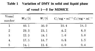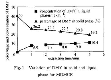 李 衛(wèi) 1,2 ,鄭 成3,寧正祥1 ( 1華南理工大學輕工與食品學院,廣東廣州510640;2 湖北工業(yè)大學化學與環(huán)境工程學院,湖北武漢430068;3廣州大學化學化工學院,廣東廣州510091) 關鍵詞;微波提。粍討B(tài)循環(huán)階段連續(xù)逆流提;二氫楊梅素;藤茶;動力學模型 引 言 微波提取是一項新型的中藥有效成分提取技術,具有加熱速度快、能耗低、提取效率高等優(yōu)點[1,3] .動態(tài)循環(huán)階段連續(xù)逆流提取是一種增大傳質推動力、提高提取效率的提取技術[4].它是將多個提取單元科學組合,使單位時間內固液兩相保持較高的濃度差,從而提高提取效率. 藤茶是中國古老的茶類資源和中草藥資源. 二氫楊梅素(dihydromyricetin,DMY)是藤茶的主要成分,具有多種生理功效,在藤茶中的含量高達3O%左右 [5]. 本研究采用具有精密控溫、控制加熱功率和時間的美國CEM公司生產(chǎn)的MARS5微波裝置,利用其一次可進行多罐提取的特點,將微波提取與動態(tài)循環(huán)階段連續(xù)逆流提取有效結合起來,即采用微波動態(tài)循環(huán)階段連續(xù)逆流提取(microwave dynamic multi stage countercurrent extraction.MDMCE)技術提取藤茶中的二氫楊梅素. 1 材料與方法 1.1 儀器與材料 MARS5微波加速反應裝置(美國CEM 公司生產(chǎn));100 ml聚四氟乙烯密閉提取罐;TSP一2oooA高效液相色譜儀(美國熱電公司生產(chǎn));藤茶(福建武夷山,粉碎并過篩后顆粒大小約為0.45 mm);二氫楊梅素標準品(廣東省果蔬深加工重點實驗室提供). 1.2 HPLC分析條件 色譜柱為Kromasil 5 m Cl8反相柱(250 mm×4.6O mm);流動相: 甲醇:水:乙酸一38:62;0.1(體積比),流速1.5 ml·rain_。,檢測波長291 nm,柱溫35℃. 1.3 MDMCE操作方法 [4,6] MDMCE操作方法根據(jù)文獻[4,6]分為建立梯度和5階段MDMCE兩個步驟. (1)建立梯度 在5個罐(編號為1 ~5 )中按一定比例加入相同質量的藤茶和相同體積的水,1 ~5 在設定條件下分別用微波提取不同時間(0.2t、0.4t、0.6t、0.8、0 min,其中t為每個罐中藤茶的總提取時間,即一個5階段MDMCE循環(huán)時問).提取完畢后罐中渣不動,1 罐與3 罐中的提取液互換,4 罐與5 罐中的提取液互換,2 罐中的提取液不動. (2)5階段MDMCE 將上述已交換提取液的5個罐同時放人微波提取裝置中,于一定條件下提取0.2t后罐中渣不動,不飽和提取液的遷移按有效成分含量遞減的反方向遷移至隔一個的單元(例如,第1階段提取完畢后不飽和提取液遷移方向為:1 罐一4 罐,2 罐一5 罐,3 罐一1 罐,4 罐一2 罐,第2~第5階段依此類推). 在第1、第2、第3、第4、第5階段,加入新鮮藤茶的罐分別為5 、4 、3 、2 、1 ,加入新鮮水的罐分別為4 、3 、2 、1 、5 .加新鮮藤茶的罐提取÷r后提取液集中收集,加新鮮水的罐提取÷r后渣排掉. 1.4 微波靜態(tài)間歇提取(microwave static batch extraction, M SBE) 用5個裝有相同質量新鮮藤茶和相同體積水的提取罐在微波提取裝置中同時提取(藤茶與水的料液比與5階段MDMCE相同,所用原料量及水量與5階段MDMCE相同),提取時間為t. 其他條件與5階段MDMCE一致. 2 結果與討論 2.1 MDMCE與MSBE比較 MDMCE提取條件:提取溫度9O℃ ,料液比1:2O(每罐藤茶3 g,提取劑60 m1),中速攪拌,微波功率600 W,一個5階段MDMCE循環(huán)提取時間為5 min (每階段提取時間1 min). 表1為1 ~5 罐在第5階段提取前后固液相中二氫楊梅素濃度變化情況(每罐提取時間均為1 rain). MSBE提取條件:提取時間為5 min,其他條件與上述5階段MDMCE提取條件相同,結果如圖1所示.