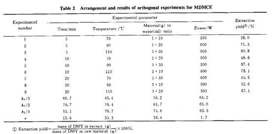 從上述圖表中的實驗數(shù)據(jù)可以看出,MDMCE在每分鐘提取時間內的初始固液相濃度差比所對應的MSBE大(盡管MSBE在第1分鐘時的初始固液相濃度差比MDMCE大,但在第2分鐘時其初始固液相濃度差比對應的MDMCE小很多). 證明采用MDMCE可以使單位時間內固液兩相保持較高的濃度差,即MDMCE的提取推動力比MSBE大.經(jīng)實驗得出,在上述條件下MDMCE 的提取率為71.3 ,而對應的MSBE提取率為52.0 .所以,在相同原料量、相同提取劑用量及相同提取條件下,MDMCE比MSBE提取效率要高. 2.2 MDMCE正交實驗結果 經(jīng)分析,選取提取時間、提取溫度、料液比及微波功率作為5階段MDMCE工藝條件的考察因子. 每因子選取3個水平. 正交實驗安排及結果見表2.從正交實驗結果可以得出,5階段MDMCE提取二氫楊梅素的最佳條件為:提取時間10 min(每階段2 min),提取溫度110℃ ,料液比1:30(每罐藤茶2 g,提取劑60 m1),微波功率600 W.在此最佳提取條件下MDMCE的提取率為92.2 ,排出渣中二氫楊梅素百分含量為3.1 oA.在此條件下所對應的MSBE提取率為67.4 ,排出渣中二氫楊梅素百分含量為13.0 . 2.3 動力學模型初步探討 根據(jù)文獻關于中草藥提取過程機制[7],藤茶中二氫楊梅素的提取過程可分3個步驟:第一步,水分子向藤茶基體內部滲透;第二步,二氫楊梅素溶解在水中;第三步,二氫楊梅素擴散遷移到溶劑主體.為簡化模型,提出如下假設:藤茶粒度大小均勻;水分子向藤茶內部滲透速度很快,并且是均勻滲透;開始H,-t~氫楊梅素在藤茶中分布是均勻的;整個提取過程溶劑無體積變化;二氫楊梅素在水中的溶解速率遠大于擴散速率.從以上假設可知,本提取過程的速率由第三步?jīng)Q定,即二氫楊梅素擴散遷移到溶劑主體是提取速率的控制步驟.根據(jù)Fick擴散定律,在無外場作用時擴散速率方程可表示為