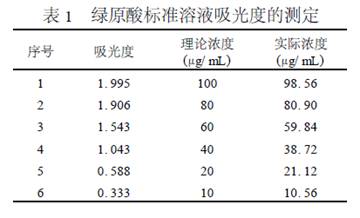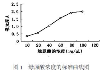 尹 波, 王科軍 (贛南師范學(xué)院化學(xué)與生命科學(xué)系, 江西 贛州 341000) 摘 要:采用超聲波法提取金銀花中的綠原酸,并與水提法進(jìn)行比較。采用薄層層析法進(jìn)行分離。用紫外分光光度法測(cè)定綠原酸的含量。實(shí)驗(yàn)結(jié)果為:超聲波法的提取率大大高于水提法,所需時(shí)間比直接用水提法所需時(shí)間縮短一半,提取條件溫和,操作簡(jiǎn)單,平均收率為19. 07 %。 關(guān)鍵詞:超聲波法; 水提法; 金銀花; 綠原酸 金銀花[1 ] 為忍冬屬( L onicera japonica Thunb. ) 忍冬植物的干燥花蕾,為中醫(yī)常用藥,具有清熱解毒,涼風(fēng)散熱,抗病毒,保肝利膽的功能。其主要活性成分為綠原酸。我國(guó)作為金銀花產(chǎn)地,在金銀花炮制、有效成分分析、含量測(cè)定等方面取得了很好的研究成果[2 ] 。對(duì)金銀花這一清熱解毒中藥的研究處于世界領(lǐng)先地位。金銀花中綠原酸的提取方法有傳統(tǒng)的水提法、乙醇回流法、水提醇沉法、酶解法、微波法等。超聲波提取[3 ] 作為一種新型的提取技術(shù),在天然產(chǎn)物提取方面得到廣泛的應(yīng)用,具有被提取活性物質(zhì)不被破壞,提取時(shí)間短等優(yōu)點(diǎn)。但用于金銀花中綠原酸的提取未見報(bào)道。本研究采用超聲波法提取金銀花中的綠原酸,取得了滿意的結(jié)果。 1 實(shí)驗(yàn)部分 1. 1 儀器與試劑 超聲波發(fā)生器( KCT- Ⅲ型數(shù)控,昆山市超聲儀器有限公司) ,旋轉(zhuǎn)蒸發(fā)儀(上海生申科技公司) ,分析天平(CG- 328 型) ,紫外可見光分光度計(jì)(722 型光柵分光光度計(jì),上海精密科學(xué)儀器有限公司分析儀器廠) ,循環(huán)水真空泵(SHZ- Ⅲ型,上海儀表(集團(tuán)) 供銷公司) ,活化的硅膠G 板(自制) ;金銀花(購(gòu)于贛州友邦大藥房,干燥粉碎后備用) ,石油醚,乙酸乙酯、甲酸、乙醇、綠原酸均為分析純。 1. 2 水提法實(shí)驗(yàn) 為了與超聲波法相比較,先用水提法對(duì)綠原酸進(jìn)行了提取,具體方法為:取6 g 干燥并粉碎的金銀花粉末于80 ℃的水浴下加熱3 次,每次1 h ,將提取液在60 ℃條件下減壓濃縮至5 mL 左右,石油醚脫色,濃縮液稀釋,測(cè)其紫外吸收。 1. 3 超聲波提取法實(shí)驗(yàn) 取6. 0 g 金銀花于燒瓶中,用適量蒸餾水分兩次提取,每次用超聲波處理提取一定時(shí)間后,分離出提取液,合并兩次提取液,使用薄層層析分離,再使用紫外分光光度計(jì)進(jìn)行測(cè)定。 1. 3. 1 硅膠吸附薄層層析- 紫外分光光度法[4 ] 將樣品點(diǎn)于活化的硅膠G板上,以乙酸乙酯∶甲酸∶水= 10∶2∶3 展開,紫外燈下觀察有藍(lán)色斑點(diǎn)的為綠原酸, 刮下斑點(diǎn), 用80 %乙醇洗脫,洗脫液定容至5 mL ,于330 nm 處測(cè)吸收值, Rf = 0. 65 。用標(biāo)樣進(jìn)行吸收值的測(cè)定,確定綠原酸提取液的最大吸收波長(zhǎng),并計(jì)算出相應(yīng)含量。 1. 3. 2 標(biāo)準(zhǔn)曲線的繪制 利用高精度分析天平,稱取綠原酸標(biāo)準(zhǔn)品0. 0044 g ,溶于25mL 蒸餾水中,然后利用該母液配成各種標(biāo)準(zhǔn)濃度, 用722 型紫外可見分光光度計(jì)在330 nm 下測(cè)定不同濃度綠原酸的吸光度,結(jié)果如表1 。