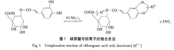 袁華,鄧良,孫炎彬,楊小俊,閆志國(guó),吳元欣+ (武漢工程大學(xué)化工與制藥學(xué)院,武漢430073) 摘要:研究杜仲葉中綠原酸含量的檢測(cè)方法。利用綠原酸和鋁離子的絡(luò)合顯色反應(yīng),采用可見(jiàn)分光光度法在波長(zhǎng)530 nm處測(cè)定杜仲葉中綠原酸量。綠原酸質(zhì)量濃度在1.7×10-4~一1.O×10-2~g·L-1。1之間線性關(guān)系良好,線性相關(guān)系數(shù)為0.9995。秋、夏葉中加標(biāo)回收率分別為98.0%,101.0%。該方法簡(jiǎn)便、實(shí)用、準(zhǔn)確。 關(guān)鍵詞:杜仲葉;綠原酸;可見(jiàn)分光光度法 杜仲(Eucommia Ulmoides 0liv.)是我國(guó)特有的經(jīng)濟(jì)樹(shù)種,其藥用價(jià)值歷來(lái)受到人們關(guān)注,2000多年前的《神農(nóng)本草經(jīng)》就將之列為中藥上品,杜仲具有降血壓、補(bǔ)肝腎、強(qiáng)筋骨、抗衰老、抗腫瘤等功效。近來(lái)的研究證實(shí)杜仲葉與皮的化學(xué)成分基本一致,其中綠原酸(Chlorogenic acid)是杜仲起藥理作用的主要有效成分之一[1-2]。因此,和金銀花、杜仲皮等原料比較,從廉價(jià)的杜仲葉中提取綠原酸是一種更為經(jīng)濟(jì)合理的工藝方法。綠原酸的分析檢測(cè)方法包括薄層掃描法、導(dǎo)數(shù)極譜法、紫外分光光度法、化學(xué)發(fā)光分析法、氣相色譜法、高效液相色譜法等多種分析方法[3-6],F(xiàn)有的綠原酸定量分析大多需要專(zhuān)門(mén)的分析儀器設(shè)備,對(duì)于實(shí)驗(yàn)室一般經(jīng)常性分析來(lái)說(shuō),費(fèi)用過(guò)高而且不及時(shí),因此非常有必要尋找一種依靠簡(jiǎn)單儀器和適合基層操作的快速、準(zhǔn)確的檢測(cè)分析方法。 本文在前人工作的基礎(chǔ)上,利用綠原酸和鋁離子的絡(luò)合顯色反應(yīng),采用可見(jiàn)分光光度法測(cè)定杜仲葉中的綠原酸。該方法儀器簡(jiǎn)單、方法簡(jiǎn)便、結(jié)果準(zhǔn)確,滿足了實(shí)驗(yàn)室和生產(chǎn)常規(guī)分析檢測(cè)的需要。 1材料與方法 1.1 測(cè)定原理 根據(jù)綠原酸類(lèi)物質(zhì)在堿性條件下與鋁離子形成穩(wěn)定的紫紅色絡(luò)合物,并產(chǎn)生特征吸收光譜而進(jìn)行測(cè)定。反應(yīng)式如圖1所示。