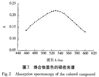 1.2主要儀器和試劑 1.2.1 主要儀器 721型分光光度計(jì)(上海分析儀器三廠); 紫外分析儀(上海顧村電光儀器廠)。 1.2.2主要試劑及標(biāo)準(zhǔn)溶液的配制 硝酸鋁、亞硝酸鈉、乙醇、氫氧化鈉均為分析純。 杜仲葉采自湖北五峰縣。 綠原酸標(biāo)樣(中國(guó)藥品生物制品檢定所)。 綠原酸標(biāo)準(zhǔn)溶液:用分析天平準(zhǔn)確稱(chēng)取綠原酸標(biāo)準(zhǔn)品0.0100 g,用95%乙醇溶解于500 mL的容量瓶中并定容,配制2×10-2g·L-1的綠原酸標(biāo)準(zhǔn)溶液。 1.3綠原酸溶液吸光度測(cè)定 取綠原酸標(biāo)準(zhǔn)溶液~定體積于10 mL容量瓶中,加入0.5 mL 5%的NaN0,和0.5 mL 10%的Al(N03)3靜置5 min,再加人2 mL 1 mol·L-1的NaoH溶液并用體積分?jǐn)?shù)95%乙醇定容,以95%乙醇作空白溶液,在530 nm處測(cè)定吸光度A。 1.4杜仲葉預(yù)處理及綠原酸量測(cè)定 準(zhǔn)確稱(chēng)取10.0 g杜仲葉,用40%乙醇溶液按料液比為1:14,在80℃下回流提取150 min,重復(fù)提取3次。通過(guò)薄層色譜分析,在紫外分析儀下觀察熒光現(xiàn)象,發(fā)現(xiàn)第3次提取液中顯示綠原酸的藍(lán)色熒光非常暗淡,說(shuō)明從杜仲葉中第3次提取的綠原酸含量非常低。因此合并第1次和第2次提取液,將提取液濃縮定容于200 mL容量瓶中。吸取100 uL提取液,點(diǎn)樣于20 cm×10 cm硅膠G薄層板上成2 cm均勻帶狀,用v(乙酸乙酯):v(甲醇):v(水)=10:4:3作展開(kāi)劑,按常規(guī)操作展開(kāi)。風(fēng)干薄板,劃出與標(biāo)準(zhǔn)品相同位置展開(kāi)點(diǎn)的譜帶,刮下吸收帶部分的硅膠置于50 mL錐形瓶中,用10 mL體積分?jǐn)?shù)80%乙醇溶液洗脫30min,將洗脫液定容至20 mL,分別量取綠原酸樣品溶液1.0,2.0,3.0,4.0,5.0mL于10 mL容量瓶中定容,按1.3方法顯色并測(cè)量吸光度A,計(jì)算杜仲葉樣品中綠原酸的含量。 2結(jié)果與討論 2.1 絡(luò)合物顯色的吸收光譜 配制一定濃度的綠原酸標(biāo)準(zhǔn)溶液,按1.3實(shí)驗(yàn)方法操作,吸光度A結(jié)果見(jiàn)圖2。由圖2可見(jiàn),吸收峰在530 nm處最大,因此選用530 nm為測(cè)定波長(zhǎng)。