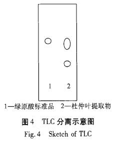2.4絡(luò)合顯色劑用量的確定 綠原酸質(zhì)量濃度在1.0×10-2g·L-1以內(nèi)時(shí),向溶液中加入5%的NaNO2和10%的A1(NO3)3溶液各0.5mL,溶液中的綠原酸可完全形成穩(wěn)定的紫紅色絡(luò)合物。A13+為配合物的中心離子,AJ(No3)3的適宜加入量為0.5 mL,較少時(shí)吸光度偏低,較多時(shí)則影響不大。NaN02用作還原劑,以防止綠原酸被氧化。 2.5絡(luò)合顯色時(shí)間的選擇 隨著溫度升高,顯色時(shí)間明顯縮短。在25℃,35℃,50℃的水浴中,絡(luò)合顯色反應(yīng)達(dá)到穩(wěn)定的時(shí)間分別為5,3,1 min。由于顯色反應(yīng)在室溫下就能在較短的時(shí)間內(nèi)完成,故選擇室溫下顯色5 min。 2.6薄層層析展開(kāi)劑的選擇 對(duì)杜仲葉提取液的薄層分離展開(kāi)劑進(jìn)行了不同組成和配比的對(duì)比實(shí)驗(yàn)分析,其中以v(乙酸乙酯):v(甲醇):v(水)=10:4:3分離效果最好,可使綠原酸與干擾物質(zhì)完全分離,Rf值0.65,薄層層析示意圖如圖4所示。