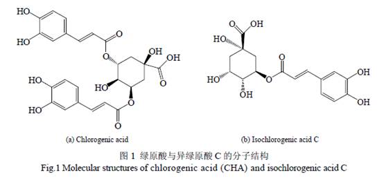 張毅敏, 譚天偉 (北京化工大學(xué)生命科學(xué)與技術(shù)學(xué)院,北京 100029) 摘 要:采用寡聚環(huán)糊精鍵合凝膠柱分離純化金銀花中的綠原酸,考察了流動(dòng)相、柱溫、負(fù)載量及介質(zhì)再生等因素對(duì)分離純化效果的影響. 分別用脲和十二烷基磺酸鈉掩蓋氫鍵和疏水作用,探討了分離機(jī)理. 結(jié)果表明,以水:乙醇:醋酸體積比為85:10:5 的混合溶液,負(fù)載量為0.5 mg/mL 進(jìn)行等度洗脫,常溫下通過(guò)一次色譜即可分離純化綠原酸,其收率和純度分別達(dá)到65%和97%以上. 介質(zhì)使用10 次后需要再生,先后經(jīng)0.3 mol/L NaOH、水和30%乙酸簡(jiǎn)單再生即可重復(fù)利用. 關(guān)鍵詞:環(huán)糊精;金銀花提取物;綠原酸;分離純化 1 前言 金銀花為忍冬科植物忍冬(Lonicera japonica Thunb.)、紅腺忍冬(Lonicera hypoglauca Miq.)或山銀花(Lonicera dasystyla confusa DC.)的干燥花蕾或初開(kāi)的花,其含有的藥物有效成分主要為綠原酸類化合物,另外還含有黃酮類、三萜皂苷類和揮發(fā)油等[1−3]. 金銀花的綠原酸提取物具有清熱解毒、散風(fēng)消腫的功能,用于治療外感風(fēng)熱、流行性感冒、癤瘡?fù)茨[諸病[4,5]. 綠原酸可以作為粉針、針劑、注射劑的醫(yī)藥原料[6]. 綠原酸(Chlorogenic Acid, CHA) 是由咖啡酸(Caffeic acid)與奎尼酸(Quinic acid)生成的縮酚酯,為苯丙素類化合物. 目前從植物中發(fā)現(xiàn)的綠原酸異構(gòu)體有7 種,其中綠原酸和異綠原酸(Isochlorogenic Acid, ICHA) C 含量較高[7]. 綠原酸是眾多抗菌解毒、消炎利膽藥材的主要有效成分,常被用作藥物定性或定量指標(biāo)[8]. 綠原酸和異綠原酸C 的分子結(jié)構(gòu)式見(jiàn)圖1.