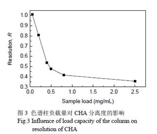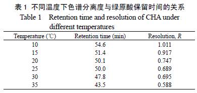 3.2 柱溫對(duì)分離效果的影響 在0.5 mg/mL(濕凝膠,下同)的負(fù)載量下,分別在不同溫度下進(jìn)行色譜分離,考察溫度與綠原酸保留時(shí)間的關(guān)系,結(jié)果如表1 所示. 在10~35℃溫度下保留時(shí)間變化不大. 10 ℃時(shí)進(jìn)行色譜分離,綠原酸的分離度為1.011,分離效果最好. 隨溫度升高,分離度下降,35℃ 時(shí)綠原酸的分離度降低到0.588. 這是由于在綠原酸的分離過(guò)程中,分子間氫鍵是比較主要的