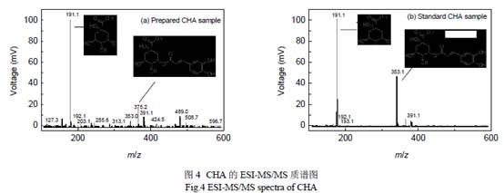 作用力. 氫鍵對(duì)溫度敏感,所以溫度改變對(duì)綠原酸分離度影響很大. 3.3 柱負(fù)載量的測(cè)定 取進(jìn)樣量為1~50 mg,對(duì)不同的進(jìn)樣量分別計(jì)算目標(biāo)產(chǎn)品綠原酸和相鄰前一雜質(zhì)的分離度(綠原酸與相鄰后一雜質(zhì)均為基線分離,故不予考慮),結(jié)果如圖3 所示. 從圖可以看出,在0.5 mg/mL 的高負(fù)載量時(shí),綠原酸的分離度在0.50 左右,純度保持在80%左右. 3.4 綠原酸樣品的質(zhì)譜鑒定 對(duì)制備的綠原酸樣品進(jìn)行質(zhì)譜鑒定和分析,方法見(jiàn)文獻(xiàn)[19]. 收集制備的綠原酸樣品在Waters Quattro Premier XE 串聯(lián)四極桿質(zhì)譜儀上進(jìn)行電噴霧質(zhì)譜(ESI-MS/MS)鑒定,結(jié)果如圖4 所示,其中峰353.1 為綠原酸的分子離子峰,峰375.2 為結(jié)合了一分子鈉的綠原酸的負(fù)離子的質(zhì)譜峰. 與標(biāo)準(zhǔn)品對(duì)照發(fā)現(xiàn),所制樣品同標(biāo)準(zhǔn)品的質(zhì)譜較一致,表明所制樣品為綠原酸,且雜質(zhì)很少. 通過(guò)質(zhì)譜檢測(cè)可知,金銀花的綠原酸提取物經(jīng)寡聚環(huán)糊精鍵合的凝膠介質(zhì)純化后,各種成分得到了有效分離,可以制得高純度綠原酸. 圖5 是綠原酸在質(zhì)譜中被轟擊后的裂解過(guò)程示意圖. 綠原酸受到轟擊后,裂解成為咖啡酸的正離子狀態(tài)和奎尼酸的負(fù)離子狀態(tài). 裂解過(guò)程有2 個(gè)途徑,一個(gè)是綠原酸的負(fù)離子直接裂解為咖啡酸的正離子狀態(tài)和奎尼酸的負(fù)離子狀態(tài),另一個(gè)是結(jié)合了1 分子鈉的綠原酸的負(fù)離子裂解為咖啡酸和奎尼酸.