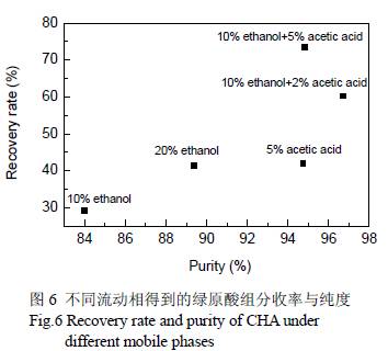 3.5 綠原酸收率和純度的關(guān)系 在0.5 mg/mL 的負(fù)載量下,分別采用不同體積比(80:20:0, 90:10:0, 85:10:5, 95:0:5, 90:0:10)的水−乙醇−乙酸三相體系作為流動(dòng)相,分段收集綠原酸流出液,采用HPLC 外標(biāo)法計(jì)算得到收集液中綠原酸的收率和純度,二者的關(guān)系如圖6 所示.