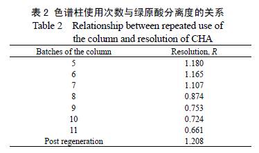 研究結(jié)果表明, 使用寡聚環(huán)糊精配基鍵合的Sepharose HP 介質(zhì)從金銀花的綠原酸提取物中精制綠原酸時(shí),使用體積比為85:10:5 的水−乙醇−乙酸三相體系分離效果最好,僅經(jīng)過(guò)一次色譜分離,純度就能達(dá)到97%,此時(shí)的收率保持在65%以上,優(yōu)于大孔吸附樹(shù)脂法所得綠原酸(純度85%,收率65.12%). 與親脂性吸附樹(shù)脂和葡聚糖凝膠Sephadex LH-20 法比較,在綠原酸純度相同的情況下,本研究方法操作簡(jiǎn)單、收率較高. 3.6 寡聚環(huán)糊精鍵合凝膠柱的再生 經(jīng)過(guò)多次制備分離后,樣品中各組分在凝膠介質(zhì)上的分離度會(huì)明顯下降,如表2 所示. 色譜柱使用10 次后色譜分離度還保持在0.7 以上,綠原酸保持較好的分離效果,當(dāng)色譜柱使用11 次時(shí),分離度降低到0.662,需要再生. 分別用丙酮、甲醇、乙醇、乙酸水溶液和NaOH水溶液對(duì)色譜柱進(jìn)行再生,結(jié)果表明單一的溶劑再生效果均不理想. 因此選擇多種溶劑對(duì)介質(zhì)進(jìn)行再生,發(fā)現(xiàn)先后用1 倍柱體積的0.3 mol/L NaOH、水和30%乙酸清洗后介質(zhì)即可再生. 再生后色譜柱對(duì)綠原酸的分離度達(dá)到1.208,分離效果很好.