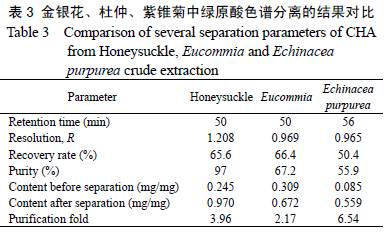 3.7 金銀花、杜仲、紫錐菊中綠原酸的分離純化 為了考察本研究方法對(duì)不同藥材中綠原酸的分離效果,選取金銀花、杜仲、紫錐菊3 種藥材的綠原酸粗提物,分別進(jìn)行了綠原酸的分離純化,得到綠原酸的精制產(chǎn)品,結(jié)果如表3 所示. 由表可以看出,本研究方法得到的3 種藥材的綠原酸分離度均達(dá)到0.96 以上. 精制 后金銀花中綠原酸產(chǎn)品純度達(dá)97%,純化倍數(shù)達(dá)3.9,紫錐菊中綠原酸的純化倍數(shù)最高,達(dá)6.54,這可能與紫錐菊的粗提物本身綠原酸的含量很低有關(guān).