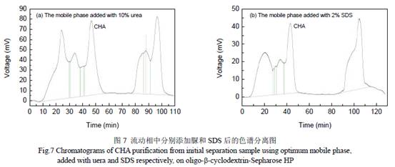 3.8 分離機(jī)理 綠原酸類物質(zhì)是由咖啡酸與奎尼酸形成的酯,其分子結(jié)構(gòu)中有疏水性的母核和親水性的側(cè)鏈基團(tuán)—羥基.綠原酸類化合物能與環(huán)糊精配基同時(shí)發(fā)生氫鍵作用和疏水作用,從而為色譜分離過(guò)程提供保留作用力[20]. 在優(yōu)化后的流動(dòng)相中添加脲和十二烷基磺酸鈉(SDS),以分別掩蓋色譜分離過(guò)程中的氫鍵和疏水作用,進(jìn)而探討了綠原酸的分離機(jī)理,結(jié)果如圖7 所示. 由圖7(a)可見(jiàn),在流動(dòng)相中添加10%脲后,綠原酸的保留時(shí)間由50 min 降為40 min,且前一雜質(zhì)的色譜峰消失,綠原酸和前一雜質(zhì)的分離度從1.208 下降到0,這表明氫鍵在綠原酸的分離過(guò)程中起了十分重要的作用,與溫度對(duì)綠原酸的分離影響一致. 由圖7(b)可以看出,添加2% SDS 后,綠原酸的保留時(shí)間同樣由50 min降為40 min,綠原酸和前一雜質(zhì)的分離度下降到0.40,這表明疏水作用同樣對(duì)綠原酸的分離純化有重要影響.