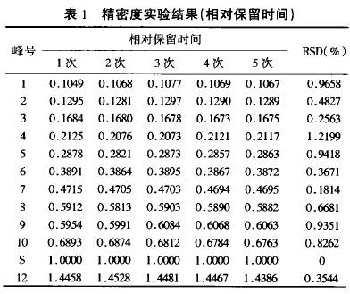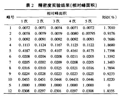 蔡光先 , 李順祥 , 蔣煒 【摘要】 目的研究金銀花超微飲片的HPLE指紋圖譜,考察其有效成分及含量,為金銀花的質(zhì)控提供可靠方法。方法色譜柱為大連依利特公司Hypersil BDS C18(4.6mm×200ram,5vm)柱。流動相為甲醇一0.05%磷酸水溶液(9.8:90.2),柱溫為25℃ ,流速為1.0ml/min,檢測波長為246nm。結(jié)果 建立了金銀花超微飲片的HPLE指紋圖譜,標定了12個共有峰。結(jié)論利用HPLE指紋圖譜可以較全面地控制金銀花超微飲片的內(nèi)在質(zhì)量。 關(guān)鍵詞 金銀花超微飲片HPLE指紋圖譜高效液相色譜法 金銀花為忍冬科植物忍冬(Lonicerae iaponica Thunb)、紅腺忍冬(L.hypoglauca Mip)、山銀花(L.confusa DC)或毛花柱忍冬(L.dasystyla Rehd)的干燥花蕾或帶初開的花⋯ ,湖南產(chǎn)灰氈毛忍冬(L.macranthoides Hand.一Mazz)E2]將列入新版藥典。本品為傳統(tǒng)中藥,具有清熱解毒、涼風(fēng)散熱的作用。本實驗對13批不同地區(qū)的商品金銀花藥材制成的超微飲片進行測定,并進行方法學(xué)考察,初步建立了指紋圖譜,標定了12個共有指紋峰,其中綠原酸為對照品。 1 儀器與試劑 島津(Shimadzu)LC一10A高效液相色譜儀(配有Lc一10Avp輸液泵,SPD一10Avp紫外檢測器,柱溫箱)。綠原酸對照品(chlorogenic acid,批號0753—200111,供含量測定用中國藥品生物制品檢定所提供),甲醇為色譜純,水為雙蒸水,其余試劑為分析純。13批商品金銀花藥材購自四川、杭州、甘肅、北京、湖南等地,經(jīng)湖南中醫(yī)藥研究院中藥研究所生藥室謝昭明研究員鑒定分別為忍冬(Lonicerae iaponica Thunb)、灰氈毛忍冬(L.macranthoides Hand.一Mazz),分別加工成超微飲片。 2 方法與結(jié)果 2.1 供試品溶液的制備精密稱取超微飲片粉末0.2g(共13種),置50ml量瓶中,加50% 甲醇約50ml,超聲處理30min,放冷,用50% 的甲醇精密加至刻度,0.45tan微孔濾膜濾過,即得。 2.2 對照品溶液的制備精密稱取綠原酸對照品4mg于50ml的棕色容量瓶中,加50% 的甲醇定容至刻度,搖勻,即得(10℃ 以下保存)。 2.3 色譜條件 色譜柱為大連依利特公司Hypersil BDSC18柱(4.6mm×200min,5tam)。色譜條件:流動相為甲醇一0.05%磷酸水溶液(9.8:90.2),柱溫為25℃ ,流速為1.0ml/min,檢測波長為246nm。該條件下金銀花超微飲片獲得好的分離,見圖1。 2.4 方法學(xué)考察 2.4.1 精密度實驗取同一份金銀花(忍冬)超微飲片的供試品連續(xù)進樣5次,比較共有指紋峰的相對保留時問和相對峰面積,結(jié)果表明各共有指紋峰的相對保留時問和相對峰面積基本一致。符合指紋圖譜的檢測要求。見表1、表2。 2.4.2 穩(wěn)定性試驗取同一份金銀花超微飲片的供試品溶液,分別在制備后1⋯4 8 16、24、48h進樣,比較各共有指紋峰的相對保留時間和相對峰面積,結(jié)果表明各共有指紋峰的相對保留時間和相對峰面積基本一致,RSD<2% ,表明樣品在48h內(nèi)穩(wěn)定,符合指紋圖譜的檢測要求。 2.4.3 重現(xiàn)性試驗取同一批金銀花(忍冬)超微飲片樣品5份,按供試品溶液制備方法分別制備供試品溶液,比較各共有指紋峰的相對保留時間和相對峰面積,結(jié)果表明各共有指紋峰的相對保留時間和相對峰面積基本一致。符合指紋圖譜的檢測要求。 2.5 指紋圖譜的建立 2.5.1 共有指紋峰的標定采用相對保留時間標定共有指紋峰:以圖譜中綠原酸為參照物(s),