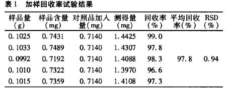 尤淑賢1,陳慶輝2(1.漳州衛(wèi)生職業(yè)學院漳州363000;2.漳州市藥品檢驗所漳州363000) 摘要:目的建立HPLC法測定金牡感冒片中綠原酸含量的方法。方法 色譜柱:依利特Hype~il BDS Cl8(4.6mm X200mm,5O m);流動相:乙腈-0.4%磷酸溶液(1O:90);流速:0.3mL-IIIin-。;柱溫:3O℃ ;檢測波長327nm;進樣量lOlL。結(jié)果在n 0476~0.9520 范圍內(nèi)呈良好的線性關(guān)系,回歸方程A=1.o58 X10 C+4.16 X10 ,r=O.9999。平均回收率為97.8%,RSD=O.84% 。結(jié)論本法專屬性強、準確度高,可用于測定金牡感冒片中綠原酸的含量。 關(guān)鍵詞:HPLC法;金牡感冒片;綠原酸;含量測定 金牡感冒片是由金銀花、貫眾、三叉苦、山甘草、葫蘆茶、薄荷油七味中藥組成,具有疏風解表、清熱解毒的功效。該制劑的質(zhì)量標準” 中規(guī)定的檢驗項目只有性狀、鑒別和常規(guī)檢查項,為了提高該制劑的質(zhì)量標準,更有效控制制劑的內(nèi)在質(zhì)量,本文采用高效液相色譜法對方中君藥——金銀花所含成分綠原酸的含量進行測定。經(jīng)方法學考察,本法專屬性強,處方中其他成分對綠原酸的測定無干擾,并且操作簡便、準確、重現(xiàn)性好,能夠作為控制金牡感冒片質(zhì)量的方法。 1 儀器與試藥 島津LC2010A高效液相色譜儀(SPD—M10A檢測儀、class—VP工作站),島津UV-2450紫外分光光度計,R200D電子天平(北京沙多利斯)。乙腈(色譜純),水(重蒸餾水),其他試劑均為分析純,綠原酸對照品(批號:0753-200111)向中國藥品生物制品檢定所購買,樣品向廠方購買。 2 實驗方法與結(jié)果 2.1 色譜條件色譜柱:依利特Hyperil BDS C18(4.6mm×200mm,5 m);流動相:乙腈 .4%磷酸溶液(10:90);流速:0.3ml·min-1;柱溫:30℃;檢測波長327nm;進樣量10uL。 2.2 對照品溶液的制備 精密稱取干燥后綠原酸對照品 11.90mg置50mL量瓶中,加50% 甲醇溶液溶解并定容,作為母液,精密移取母液1mL置5mL量瓶中,用50% 甲醇稀釋定容即得47.6ug·mL-1 對照品溶液。 2.3 供試品溶液的制備取本品20片研成粉末混勻后取約0.5g,精密稱定,精密加入50% 甲醇50mL,稱定重量,超聲波提取30rain后,放冷,用50% 甲醇補足重量,濾過,取續(xù)濾液作為供試品溶液。 2.4 穩(wěn)定性試驗取同一濃度的金牡感冒片供試品溶液分別在2、4、8、12、24h進樣10 ,測定綠原酸峰面積積分值,結(jié)果供試品在24h內(nèi)穩(wěn)定,RSD為0.92%(n=5)。 2.5 線性關(guān)系考察取濃度為47.6ug·mL 的綠原酸對照品溶液分別進樣2、5、10、15、20 ,測定峰面積,以峰面積積分值A(chǔ)為縱坐標,對照品進樣量c為橫坐標作線性回歸,得 回歸方程A=1.058×107C+4.16×103,r=0.9999,結(jié)果表明,綠原酸在0.0476~0.9520ug范圍內(nèi)呈良好的線性關(guān)系。 2.6 重復性試驗取同一批樣品5份,按2.3項下方法制成供試品溶液,測得綠原酸含量平均值為7.31mg·g~,RSD=1.22% ,結(jié)果表明本法重現(xiàn)性良好。 2.7 精密度試驗精密吸取綠原酸對照品溶液(47.6ug·mL -1)重復進樣5次,每次10 ,測得綠原酸峰面積相對偏差RSD為0.87% ,結(jié)果表明本法精密度良好。 2.8 加樣回收率試驗取已知含量(7.25mg·g-1 )的樣品5份,每份精密稱取約0.1g,分別精密加入綠原酸對照品溶液(0.238mg·mL -1)3mL,按供試品的制備與測定方法測得綠 原酸含量,計算回收率,結(jié)果平均回收率為97.8% ,RSD=0.84% ,結(jié)果(見表1)。