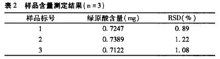 2.9 樣品的測定取不同批號樣品3批,按2.3項下方法制成供試品溶液,精密吸取供試品溶液及綠原酸對照品溶液各10ul分別注入色譜儀,按2.1項下色譜條件測定,計算綠原酸含量,結(jié)果(見表2)。