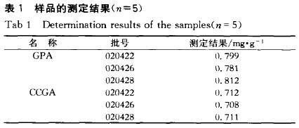 2.1.2 系統(tǒng)適用性色譜柱理論塔板數(shù)(N)按京尼平苷酸計(jì)酸為5200,與相鄰峰分離度≥ 1.5,拖尾因子為1.15;按綠原酸計(jì)算N為5500,拖尾因子為1.08。 2.1.3 測(cè)定波長(zhǎng)的選擇分別取綠原酸和京尼平苷酸對(duì)照品溶液于紫外光區(qū)190~400 nm 范圍內(nèi)進(jìn)行掃描,CGA的最大吸收波長(zhǎng)在325 nm,第二吸收波長(zhǎng)為238 nm,GPA的最大吸收波長(zhǎng)則在235 nm左右,確定236 nm為測(cè)定波長(zhǎng)。 2.2 對(duì)照品溶液的制備準(zhǔn)確稱取GPA對(duì)照品6.8mg、CGA對(duì)照品7.1 mg,用色譜純甲醇溶解并定容至5 mL,得到濃度為1.36 g·L-1的GPA、1.42 g·L-1的CGA對(duì)照品混合儲(chǔ)備液,冷藏保存。 2.3 樣品溶液的制備 準(zhǔn)確稱取0.1 g杜仲顆粒樣品,加人適量50 的甲醇一水溶液,超聲溶解20 min 2次,移人25 mL量瓶中,再用50%的甲醇一水溶液定容至刻度,搖勻,過濾。準(zhǔn)確吸取濾液1.0 mL于10mL量瓶中,用流動(dòng)相稀釋、定容至刻度,搖勻。用0.45um濾膜過濾后,即得待測(cè)液。 2.4 線性關(guān)系考察取對(duì)照品儲(chǔ)備液用流動(dòng)相溶液稀釋,配制成對(duì)照品系列混合溶液,GPA:0.034,0.068,0.136,0.272,0.544 g ·I -1 ;CGA :0.034,0.071,0.142,0.284,0.568 g·L-1。各進(jìn)樣6ul,平行5次。結(jié)果GPA和CGA的峰面積y與其進(jìn)樣濃 度X(g·L-1)存在良好的線性關(guān)系: CGA :Y = 一608 71+ 4 322 500X ,r= 0.998 6,線性范圍:0.036~0.568 g·L-1 GPA:Y = 一377 20+ 6 043 800X ,r= 0.996 9,線性范圍:0.034~0.544 g·L-1 2.5 精密度試驗(yàn)精密吸取GPA含量為0.080 g·L-1;CGA為0.072 g·L-1 的樣品溶液6 ul,重復(fù)進(jìn)樣5次,測(cè)得RSD分別為:GPA 0.61 %,CGA 0.72 %(n= 5)。 2.6 穩(wěn)定性實(shí)驗(yàn)精密吸取GPA含量為0.080 g·L-1;CGA為0.072 g·L-1的混合溶液6 ul,每間隔一段時(shí)間進(jìn)樣測(cè)定一次,實(shí)驗(yàn)表明,該混合溶液在10 d內(nèi)基本穩(wěn)定。 2.7 加標(biāo)回收率測(cè)定精密稱取適量的已測(cè)定含量的樣品5份,分別加人一定量的GPA、CGA對(duì)照品,采用2.3方法制備樣品,過濾后分析,測(cè)定回收率,結(jié)果平均含量分別為99.03%,99.99%。 2.8 重復(fù)性試驗(yàn) 按“2.3”項(xiàng)制備杜仲顆粒樣品溶液,進(jìn)樣6 ul,重復(fù)5次。試驗(yàn)結(jié)果測(cè)得GPA,CGA含量分別為0.799,0.712 mg·g-1,RSD 分別為0.134%,1.72%。 2.9 樣品的測(cè)定分別對(duì)3批杜仲顆粒樣品進(jìn)行測(cè)定,各樣品中GPA、CGA的含量測(cè)定結(jié)果見表1。