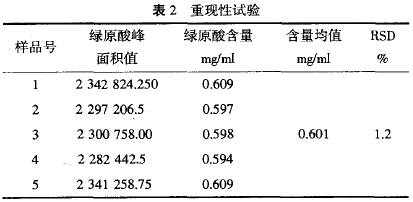 測(cè)定結(jié)果表明,綠原酸對(duì)照品在進(jìn)樣量0.223—2.23 范圍內(nèi)呈良好的線性關(guān)系。 2.6 精密度試驗(yàn):精密吸取上述第3的對(duì)照品溶液20 l,重復(fù)進(jìn)樣5次,測(cè)定、記錄峰面積,求得平均峰面積為2 168 914.05,相對(duì)標(biāo)準(zhǔn)偏差(RSD)為0,4%。結(jié)果說(shuō)明本法精密度良好。 2.7 穩(wěn)定性試驗(yàn):精密吸取同一供試品溶液(批號(hào):070104),在室溫下,分別配制后0、1、4、12、24 h進(jìn)行綠原酸峰面積測(cè)定,每次進(jìn)樣20 l,測(cè)定。求得平均峰面積為2 288 724.975,RSD為1.2%。結(jié)果表明供試品溶液在24 h內(nèi)基本穩(wěn)定。 2.8 重珊陛試驗(yàn):精密稱取樣品5份(批號(hào):070104),按供試品溶液制備方法操作,依法進(jìn)樣測(cè)定,計(jì)算含量,求RSD。結(jié)果表明,本法測(cè)定具有良好的重現(xiàn)性,結(jié)果見(jiàn)表2。