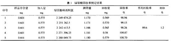 2.9 回收率測(cè)定:采用加樣回收法,精密稱取已知含量的同一批號(hào)樣品(批號(hào):070104)(綠原酸含量為0.601 mg/m1)約1 ml,置10ml量瓶中.精密加入對(duì)照品溶液(濃度為1.115 mg/m1)0.5 m1.加50%甲醇稀釋至刻度,搖勻,即得。按正文方法,進(jìn)樣、測(cè)定、計(jì)算。結(jié)果表明,本法具有較好的回收率。結(jié)果見(jiàn)表3。