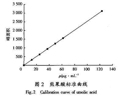 2.2 線性關(guān)系 精密吸取標(biāo)準(zhǔn)溶液0.1 mL、0.2 mL、0.3 mL、0.4 mL、0.5 mL和1.0 mL,分別置于1 mL容量瓶中,甲醇定容。所得溶液質(zhì)量濃度分別為l2.30 ug/ml、24.60 ug/ml、36.90 ug/ml、49.20 ug/ml、61.50 ug/ml和123.00 ug/ml,按1.2色譜條件測(cè)定。每份對(duì)照液測(cè)定5次,取峰面積平均值,得線性回歸方程為y=25.367 5x+0.546 9,線性范圍為0.2 t,g/mL~103ug/mL,r=0.999 7,熊果酸標(biāo)準(zhǔn)曲線見圖2。 2.3 精密度及回收率實(shí)驗(yàn) 取49.20 ug/mL標(biāo)準(zhǔn)溶液,補(bǔ)充進(jìn)樣3次,共8次,所得結(jié)果平均值為48.43ug/mL,計(jì)算RSD=1.56%。精密量取熊果酸質(zhì)量濃度為l0.13 ug/mL供試液2 mL,定量精確加入標(biāo)準(zhǔn)溶液(24.60ug/mL)0.2 mL、0.4 mL、0.6 mL及1.0 mL,使用與樣品相同的方法制備和測(cè)定,取5次測(cè)定平均值計(jì)算回收率,回收率在96.4% ~101.3%,結(jié)果見表1。