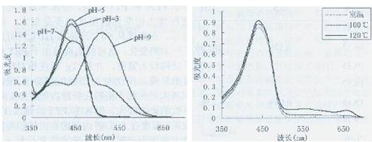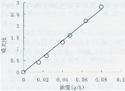 圖1室溫時(shí)大黃素在不同pH值條件下的穩(wěn)定性圖2 pH=5時(shí)大黃素在不同溫度下的穩(wěn)定性由圖1能看出大黃素在酸性條件下是相當(dāng)穩(wěn)定的隨著PH值逐漸增大到中性時(shí),大黃素開始慢慢發(fā)生變化最大吸收波長逐漸偏移,當(dāng)pH值變?yōu)閴A性時(shí)吸收譜圖已完全改變,產(chǎn)生了明顯的色變,這可能是由于大黃素分子結(jié)構(gòu)巾含多個(gè)羥基,在堿性介質(zhì)中羥基離子化造成的。所以染色時(shí)應(yīng)選擇在酸性條件下進(jìn)行。 另外,由圖2可知,大黃素的熱穩(wěn)定性也是非常出色的即使在120℃的高溫下也未發(fā)生分解,由此可見大黃素適合在高溫條件下對(duì)聚酯類纖維進(jìn)行染色。 2.2標(biāo)準(zhǔn)工作曲線:
