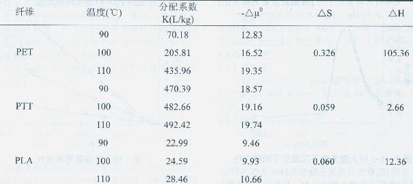 表1列出了不同溫度下的分配系數(shù)K及一些熱力學(xué)數(shù)據(jù),從表1可以看出三種纖維的分配系數(shù)、染色親和力都隨溫度的升高而增大,三種纖維的染色熱、染色熵均為正值。 對(duì)于PLA和PTT纖維,分配系數(shù)雖隨溫度提高而逐漸增大但變化的幅度卻不是很大,而對(duì)于PET而言,在溫度從90℃升高到110℃時(shí)分配系數(shù)發(fā)生了巨大的變化。這可能主要是由于PET纖維本身分子結(jié)構(gòu)較為緊密,并且Tg溫度相對(duì)較高,隨著溫度的升高,纖維內(nèi)分子運(yùn)動(dòng)加劇,纖維內(nèi)部自由體積增大更有利于染料在纖維內(nèi)部擴(kuò)散,溫度對(duì)分配系數(shù)的影響較大。PLA和PTT纖維的Tg溫度相對(duì)較低,溫度在90℃時(shí)內(nèi)部的自由體積可能都已接近最大值所以分配系數(shù)升高的幅度不大。 表1大黃素上三種纖維的熱力學(xué)數(shù)據(jù)
