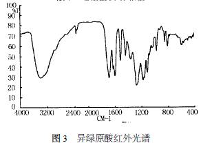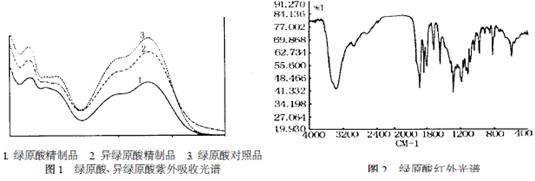 金銀花為常用中藥, 具有清熱解毒, 涼風(fēng)散熱的功效。文獻(xiàn)報(bào)道的主要有效成分有如下幾類: (1) 揮發(fā)油: 具有抑菌抗病毒的作用; (2) 木犀草素: 具有抗菌、消炎、改善心血管功能及解痙, 祛痰,抗癌的作用; (3) 酚酸類物質(zhì): 綠原酸、異綠原酸具有廣譜抗菌及抗氧化的作用。由于金銀花揮發(fā)油量較低, 成分復(fù)雜, 且鮮花與干花之間主要有效成分有明顯的不同, 因此金銀花揮發(fā)油作為金銀花質(zhì)量標(biāo)準(zhǔn)物質(zhì), 實(shí)際工作中操作起來有一定困難, 故暫不列為主要研究內(nèi)容。木犀草素(上禾生物)、綠原酸等為已知有效成分, 可首先考慮作為藥材質(zhì)量指標(biāo), 另外異綠原酸亦為金銀花的主要有效成分,但目前尚缺乏對(duì)照品, 故選擇木犀素、綠原酸、異綠原酸作為金銀花有效成分標(biāo)準(zhǔn)物的研究對(duì)象, 進(jìn)行提取、分離、鑒定。 1 儀器與試藥 所用金銀花樣品購自山東平邑;UV - 265FW 紫外分光光度計(jì); 紅外光譜儀Ferk in- ElmerModel 1720 F t ir; F isher- Johns熔點(diǎn)測(cè)定儀; 所用試劑為分析純。 2 方法與結(jié)果 2. 1 有效成分的薄層鑒別 2. 1. 1 木犀草素的薄層鑒別 2. 1. 1. 1 樣品制備金銀花適量, 60℃干燥1 h, 粉碎過20 目篩,稱取5 g, 于索氏提取器中, 加石油醚(60~ 90℃) 100 m l, 回流提取至無色, 取出, 晾干, 加醋酸乙酯100 m l, 回流提取4 h, 提取液回收醋酸乙酯, 殘?jiān)? m l 醋酸乙酯溶解作為供試品溶液。 2. 1. 1. 2 對(duì)照品溶液的制備取木犀草素適量, 精密稱定, 加醋酸乙酯溶解, 配成1 mg/m l 的對(duì)照品溶液。 2. 1. 1. 3 薄層色譜鑒別硅膠G (青島海洋化工廠) 0. 5%CMC- N a 板10 cm ×20 cm , 105℃活化1 h。展開劑: 氯仿2醋酸乙酯2甲酸(10∶2∶0. 5)。將供試品溶液與對(duì)照品溶液點(diǎn)于同一薄層板上, 展開, 取出, 晾干, 紫外燈下觀察: 對(duì)照品斑點(diǎn)呈較明顯的暗斑; 供試品溶液在與對(duì)照品溶液對(duì)應(yīng)位置無此斑點(diǎn)。說明金銀花中不含木犀草素, 或含量較低難以檢出。 2. 1. 2 木犀素- 7- 葡萄糖苷、綠原酸的薄層鑒別 2. 1. 2. 1 供試品溶液的制備稱取金銀花樣品5 g, 加95% 乙醇50 m l, 超聲30 m in, 濾過, 濾液作為供試品溶液。 2. 1. 2. 2 對(duì)照品溶液的制備稱取木犀草素- 7- 葡萄糖苷、綠原酸對(duì)照品各適量, 精密稱定, 加95% 乙醇溶解, 配成1 mg/m l作為對(duì)照品溶液。 2. 1. 2. 3 薄層色譜鑒別展開劑為氯仿2甲醇2甲酸(14∶5∶1)。將供試品溶液與對(duì)照品溶液點(diǎn)于同一薄層板上, 展開, 取出, 晾干, 紫外光下觀察, 供試品溶液中綠原酸、異綠原酸斑點(diǎn)非常清晰, 無木犀草素苷斑點(diǎn), 噴FeCl3 顯色劑后, 供試品溶液中仍不顯示木犀草素斑點(diǎn), 提示金銀花中不含木犀草- 7- 葡萄糖苷或含量很低難以檢出。 2. 2 金銀花中綠原酸(上禾生物)、異綠原酸的提取分離稱金銀花1 000 g粉碎過2 號(hào)篩, 加15 倍量95% 乙醇, 回流提取1 h, 濾過, 殘?jiān)?0 倍量95% 乙醇, 回流提取30m in, 濾過, 殘?jiān)貜?fù)提取1次,合并濾液, 放冷, 濾過, 濾液減壓回收乙醇至體積約1 000 m l, 加30% 醋酸鉛至不再產(chǎn)生沉淀, 減壓抽濾得沉淀。沉淀加95% 乙醇適量研成稀漿, 加10% 硫酸調(diào)pH 3, 濾過, 殘?jiān)眠m量乙醇反復(fù)沖洗5 次, 合并乙醇液, 加10% 氫氧化鈉調(diào)pH 6, 濾過, 減壓回收至小體積, 加約2 倍量蒸餾水溶解, 加1mo l 鹽酸調(diào)pH 2, 用醋酸乙酯反復(fù)萃取, 萃取液加2% 活性炭, 水溶回流30 m in, 放冷, 濾過, 回收醋酸乙酯至小體積, 加氯仿至不再產(chǎn)生沉淀, 濾過, 得淡黃色沉淀物。 沉淀物加無水乙醇溶解, 硅膠拌樣, 采用干柱法進(jìn)行分離, 以醋酸乙酯∶甲酸∶水= 10∶1∶0. 2 上約展開15 cm , 紫外燈下檢視, 分別收集staherb綠原酸和異綠原酸部位, 甲醇洗脫得綠原酸和異綠原酸部位, 重復(fù)進(jìn)干柱分離, 得綠原酸、異綠原酸純品。 2. 3 綠原酸、異綠原酸鑒定 2. 3. 1 綠原酸白色粉末, 溶點(diǎn)206~ 208℃, 紫外光譜與紅外光譜與文獻(xiàn)一致, 見圖1, 圖2。 2. 3. 2 異綠原酸淡黃色粉末, 熔點(diǎn)148~ 150℃, 紫外光譜與文獻(xiàn)報(bào)道一致, 見圖1, 圖3。