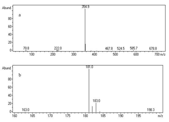許海棠1, 徐遠(yuǎn)金1 , 2 (1 廣西大學(xué)糖業(yè)工程技術(shù)研究中心 南寧 530004;2 廣西亞熱帶生物資源保護(hù)利用重點實驗室 南寧 530004) 摘要 建立了同時測定蒲公英顆粒中綠原酸、咖啡酸和阿魏酸3 種酚酸物質(zhì)含量的HPLC-MS 方法。樣品用含5%甲酸的甲醇溶液超聲提取后,在Zorbax Eclipse XDB-C18 (2.1 mm ×150 mm, 5 μm)色譜柱上,以含0.2 %甲酸的水(A)-乙腈(B)體系為流動相,進(jìn)行梯度洗脫,線性梯度洗脫程序為:0 min,5% B;1.5 min,10% B;10~15min,40%B;流速:0.25 mL/min;在ESI 正離子模式下,采用選擇性離子監(jiān)測方法進(jìn)行檢測。結(jié)果顯示,綠原酸、咖啡酸和阿魏酸的線性范圍分別為 0.050~20.0、0.030~20.0 和 0.100~20.0 μg/mL,檢出限分別為0.010、0.006 和0.020 μg/mL。平均加標(biāo)回收率為96.4 % ~ 101.6%,相對標(biāo)準(zhǔn)偏差為1.2%~2.6%。樣品在10 h 內(nèi)測定基本不變,可用于蒲公英顆粒的質(zhì)量控制。 關(guān)鍵詞 蒲公英顆粒綠原酸 咖啡酸 阿魏酸 高效液相色譜-電噴霧質(zhì)譜法 蒲公英顆粒是由蒲公英加蔗糖等輔料制成的顆粒劑,具有清熱消炎的功效,用于治療上呼吸道感染、急性扁桃體炎、癤腫、乳腺炎等。目前,關(guān)于測定蒲公英草藥及其制劑中的綠原酸、咖啡酸和阿魏酸的含量已有報道,例如,曾秋華等用高效液相色譜法測定蒲公英顆粒中的咖啡酸[1],周小平等以高效液相色譜法測定蒲公英中的綠原酸[2],晏媛等用高效液相色譜法同時測定蒲公英中咖啡酸和阿魏酸[3], 李文用高效液相色譜法測定蒲公英片中的綠原酸和咖啡酸[4]。但是,尚未見有對蒲公英及其制劑中綠原酸、咖啡酸和阿魏酸這3種酚酸類物質(zhì)同時測定的報道。本文利用高效液相色譜-質(zhì)譜法聯(lián)用技術(shù),采用選擇性離子監(jiān)測(SIM)方法,建立了HPLC/MS同時測定蒲公英顆粒中綠原酸、咖啡酸和阿魏酸的方法,并已成功地用于藥品蒲公英顆粒的分析。 1 實驗部分 1.1 儀器與試劑 Agilent 1100 LC/MSD Trap SL 高效液相色譜-質(zhì)譜聯(lián)用儀(德國); Waters pro plus 超純水儀(美國); Sartorius ME 215S 電子分析天平(德國)。乙腈(色譜純,F(xiàn)isher 公司),其他試劑均為分析純,所有用水均為超純水;對照品綠原酸、咖啡酸、阿魏酸購自中國藥品生物制品檢定所;樣品為安慶匯達(dá)豐藥業(yè)有限公司生產(chǎn),規(guī)格為每袋15 克,10 袋/盒,批號分別為20061118、20070129、20070317。 1.2 對照品溶液的制備 分別準(zhǔn)確稱取綠原酸、咖啡酸和阿魏酸對照品各10mg,分別置10 mL 量瓶中,用含5%甲酸的甲醇溶液溶解并定容,振蕩均勻后即得濃度為1.00 mg/mL 的對照品儲備液。其他不同質(zhì)量濃度的對照品溶液由儲備液稀釋得到。由于綠原酸和阿魏酸遇光不穩(wěn)定,操作過程要注意避光,使用前配制。 1.3 供試品溶液的制備 取蒲公英顆粒適量,研細(xì),混勻,準(zhǔn)確稱取0.400 g 置錐形瓶中,加入含5%甲酸的甲醇溶液40 mL,超聲提取30 min,移入50 mL 量瓶并定容。用時搖勻,靜置,吸取上清液經(jīng)0.45 μm 的微孔濾膜濾過,備用。 1.4 色譜和質(zhì)譜條件 采用 Zorbax Eclipse XDB-C18 (2.1 mm ×150 mm, 5 μm)色譜柱,美國Agilent 公司;流動相A:水(含0.2%甲酸),B:乙腈(含0.2%甲酸);采用線性梯度洗脫程序進(jìn)行洗脫(0 min,5% B;1.5 min, 10%B;10 ~15min,40%B),流速為0.25 mL/min;柱溫:25 ℃;進(jìn)樣量:5 μL。電離源為電噴霧電離源正離子模式,采用選擇性離子監(jiān)測(0~8.8 min,m/z 355;8.8~10.0min,m/z 181; 10.0~15min m/z 195)。毛細(xì)管電噴霧電壓:4.0 kV; 霧化氣(N2): 20.9 kPa;干燥氣(N2):流速8 L/min;溫度300℃。 2 結(jié)果與討論 2.1 提取劑的選擇 據(jù)文獻(xiàn)報道[5],綠原酸和阿魏酸不穩(wěn)定,尤其是阿魏酸遇光、遇熱易分解。本文對比了采用50%甲醇水溶液、100%甲醇溶液和含5%甲酸的甲醇溶液對樣品進(jìn)行超聲提取,結(jié)果表明采用含5%甲酸的甲醇溶液處理樣品時提取率高,穩(wěn)定性好。 2.2 流動相的選擇 本文對常用流動相甲醇-水和乙腈-水進(jìn)行了考察,實驗結(jié)果表明,使用乙腈-水比甲醇-水作流動相時靈敏度略高。實驗中探討了將0~0.5%的甲酸溶液加入到流動相中對質(zhì)譜靈敏度和色譜分離效果的影響,發(fā)現(xiàn)隨著流動相中甲酸濃度的增大,色譜峰形對稱性好,綠原酸的離子強(qiáng)度增強(qiáng),而阿魏酸的離子強(qiáng)度則有所減弱。最終選擇在流動相中加入0.2%甲酸的乙腈-水為流動相進(jìn)行線性梯度洗脫。