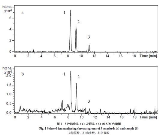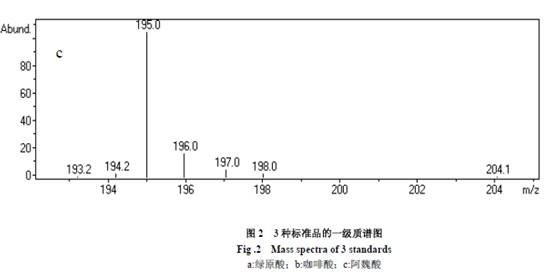 2.3 質(zhì)譜條件的優(yōu)化 有文獻(xiàn)報道,采用液相色譜-質(zhì)譜測定藜蒿中綠原酸[6]、測定綠原酸的水解動力學(xué)及鑒定水解產(chǎn)物[7]和測定水溶性迷迭香提取物中的阿魏酸和咖啡酸[8]時,均是在負(fù)離子模式下進(jìn)行掃描。本文分別采用了正離子模式和負(fù)離子模式進(jìn)行對比,發(fā)現(xiàn)在本試驗條件下,采用正離子模式掃描,對3種酚酸的檢測較靈敏。由于阿魏酸遇光、遇熱易分解[5],本文比較了常用霧化室溫度300~350℃對電離的影響,結(jié)果表明,霧化室溫度采用300℃比較適宜。在選定的色譜-質(zhì)譜條件下,被測組分間獲得較好的分離,色譜圖見圖1。根據(jù)峰的保留時間及質(zhì)譜信息進(jìn)行定性,其質(zhì)譜特征離子圖譜見圖2。從圖譜2 中,可以看出3 種酚酸的 [M+H]+峰較明顯,因此,進(jìn)行選擇性離子監(jiān)測時,我們分別對綠原酸(m/z)355;咖啡酸(m/z)181;阿魏酸 (m/z)195 的碎片離子進(jìn)行監(jiān)測。