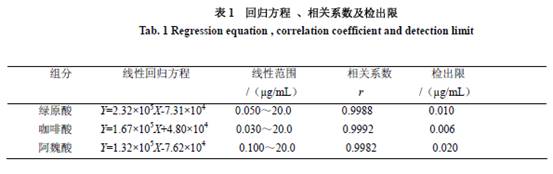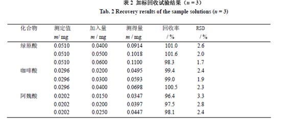 2.4 線性關(guān)系及檢出限 分別吸取對照品儲備液適量,以含5%甲酸的甲醇溶液配制成濃度為0.050~20.0 μg/mL 的綠原酸系列溶液、濃度為0.030~20.0 μg/mL 的咖啡酸系列溶液及濃度為0.100~20.0 μg/mL 的阿魏酸系列溶液。取上述系列標(biāo)準(zhǔn)溶液各5 μL 進(jìn)樣分析,記錄各色譜峰的峰面積。以各對照品的峰面積(3 次平均值)對其質(zhì)量濃度(μg/mL)進(jìn)行線性回歸,得到回歸方程和相關(guān)系數(shù)。以信噪比等于3 計,得到上述3 種組分的檢出限,均列于表1。 2.5 精密度試驗 準(zhǔn)確吸取含綠原酸、咖啡酸和阿魏酸均為5.00 μg/mL 的混合對照品溶液,按1.3 節(jié)所述供試品溶液的制備方法準(zhǔn)備測試液,在同一天內(nèi)重復(fù)進(jìn)樣6 次,計算日內(nèi)精密度RSD。結(jié)果3 種酚酸的峰面積的RSD 分別為0.68%,0.52%,0.79%,表明方法精密度好。