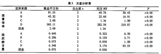 3.4 方差分析上述試驗(yàn)所用正交表除各因子列外,無空白列作對照,所以采用常規(guī)方法,將離差平方和中最小的項(xiàng)來近似作為誤差的估計,用來計算各因子列的F比值 [6],采用SPSS 11.5統(tǒng)計軟件包進(jìn)行數(shù)據(jù)統(tǒng)計,實(shí)驗(yàn)結(jié)果見表3。 以總浸膏得率為考察指標(biāo),由表3方差分析結(jié)果結(jié)合表2極差R值進(jìn)行分析,各指標(biāo)因素的主次順序D>A>B>c,最優(yōu)方案為D3A1B3c2,以金銀花得率為考察指標(biāo),各指標(biāo)因素的主次順序仍為D>A>B>c,最優(yōu)方案為D3A3B3C1,綜合兩個考察指標(biāo)工藝條件,金銀花煎煮的最佳工藝為A1B3C1 D3。 3.5 驗(yàn)證實(shí)驗(yàn) 按最佳工藝條件A1B3C1D3進(jìn)行驗(yàn)證實(shí)驗(yàn),兩次實(shí)驗(yàn)平均結(jié)果為金銀花總浸膏得率為60.74%,綠原酸含量為6.78%,實(shí)驗(yàn)結(jié)果較為理想,說明該工藝條件簡單、穩(wěn)定、可行。