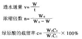 1.2.2 綠原酸提取液的制備 在水蒸汽蒸餾提取芳香油的過程中(約4h),金銀花的組織結(jié)構(gòu)已完全軟化和破壞,故可以直接用水在室溫下從金銀花提油殘?jiān)刑崛【G原酸。金銀花提油殘?jiān)c水以1:1的比例混合打漿,用15% NaOH和HC1在不斷攪拌的條件下調(diào)節(jié)混合漿液的pH6.5~7,用袋式過濾器過濾,擠壓濾渣。濾渣再加1:1的水打漿,調(diào)節(jié)PH6.5~7, 過濾,擠壓濾渣,合并濾液,即得綠原酸提取液。 1.2.3 綠原酸提取液的微孔過濾 分別選用MF1和MF2膜對(duì)綠原酸提取液進(jìn)行微孔過濾,以除去不溶性固體微粒。在微孔過濾實(shí)驗(yàn)中,分別稱取MF1和MF2膜的透過液和原始液質(zhì)量,并記錄各自的微孔過濾時(shí)間, 計(jì)算透水通量和濃縮倍數(shù),根據(jù)透水通量的大小選擇適當(dāng)?shù)奈⒖走^濾膜。 1.2.4 微孔透過液的超濾 經(jīng)微孔過濾處理后的綠原酸透過液,分別選用UF1和UF2膜對(duì)其進(jìn)行超濾,以除去大分子物質(zhì)及膠體物質(zhì),如蛋白質(zhì)、多糖(淀粉、纖維素等)、鞣質(zhì)或其復(fù)合物等。在超濾實(shí)驗(yàn)中,分別稱取UF1和UF2膜的透過液和原始液質(zhì)量,并記錄各自的超濾時(shí)問,計(jì)算透水通量和濃縮倍數(shù),根據(jù)透水通量的大小選擇適當(dāng)?shù)某^濾膜。 1.2.5 超濾透過液的納濾實(shí)驗(yàn) 經(jīng)超濾處理后的綠原酸透過液,分別選用NF 1和NF2膜對(duì)其進(jìn)行納濾處理,以除去水(濃縮)及小分子物質(zhì)(脫鹽),如無機(jī)鹽等。在納濾實(shí)驗(yàn)中,分別稱取NF1和NF2膜的透過液和原始液質(zhì)量,并記錄各自的納濾時(shí)問, 計(jì)算透水通量和濃縮倍數(shù),根據(jù)透水通量的大小和綠原酸的截留率選擇適當(dāng)?shù)募{濾膜。 1.2.6 水洗對(duì)綠原酸的截留率的影響 分別取MF2微濾和UF1及UF2超濾的濃縮液,各加等質(zhì)量的去離子水,攪拌,再分別用MF2、UF1和UF2膜對(duì)其進(jìn)行微濾和超濾,至原濃縮液質(zhì)量,分別測(cè)定微濾和超濾濃縮液以及微濾和超濾透過液中綠原酸的含量,分別計(jì)算水洗前后綠原酸的截留率。 1.2.7 膜分離過程各物料的成分分析 分別取MF2.UF2.NF2膜分離過程的各物料樣品,測(cè)定其綠原酸的含量、電導(dǎo)率和總可溶性固形物的含量。 1.3 測(cè)定與分析方法 1.3.1 透水通量與截留率測(cè)定[11] 在膜分離過程中,分另0稱取相應(yīng)的原始液和透過液質(zhì)量,并記錄各自的膜分離時(shí)間。分別測(cè)定相應(yīng)的原始液、透過液和濃縮液中的綠原酸的含量,按下述公式分別計(jì)算相應(yīng)的透水通量、濃縮倍數(shù)和綠原酸的截留率: