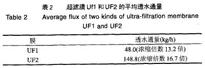 2.2 超濾膜的選擇 金銀花在水蒸汽蒸餾過程中長(zhǎng)時(shí)間受熱, 其組織結(jié)構(gòu)已完全解體,金銀花中的大分子物質(zhì)及膠體物質(zhì)完全進(jìn)入綠原酸提取液中,蒸餾殘?jiān)木G原酸提取液十分渾濁,根本無法澄清。超過濾是除去提取液中的大分子物質(zhì)及膠體物質(zhì),如蛋白質(zhì)、多糖(淀粉、纖維素等)及其復(fù)合物等,使溶液澄清化的良好方法。超濾膜材料不同, 超濾的透水通量和過程的有效性可能有差異,超濾膜UF1和UF2平均透水通量見表2(45~50℃ ,P=0.3MPa1。由表2可知,UF1膜在13.2倍濃縮時(shí)的平均透水通量是48.0kg/h,UF2膜在16.7倍濃縮時(shí)的平均透水通量是148.8kg/h,UF2膜的平均透水通量遠(yuǎn)大于UF1膜,可能是由于一些蛋白質(zhì)、多糖類大分子物質(zhì)更容易堵塞超濾膜UF1的膜孔,使透水通量降低。故超濾實(shí)驗(yàn)選用膜UF2為宜。