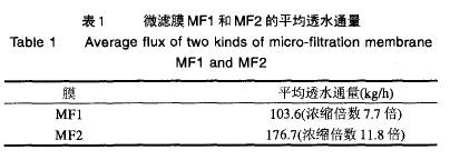 式中,s為樣品峰面積;s o為對(duì)照品峰面積;c。為對(duì)照濃度(mg/L);W 為樣品重量(mg);1/4為為測(cè)定常數(shù)。 1.3.3 電導(dǎo)率的測(cè)定[13] 用電導(dǎo)率儀分別測(cè)定膜分離過程中各物料的電導(dǎo)率, 以電導(dǎo)率表示相應(yīng)物料中的鹽類物質(zhì)的相對(duì)含量。 1.3.4 總可溶性固形物含量的測(cè)定[13] 將膜分離過程中的物料各精確取樣,放入干燥箱中, 于105℃干燥至恒重,測(cè)定相應(yīng)的總可溶性固形物的含量。 2 結(jié)果與分析 2.1 微濾膜的選擇 由于金銀花在水蒸汽蒸餾過程中長(zhǎng)時(shí)間受熱,其組織結(jié)構(gòu)已完全解體,蒸餾殘?jiān)木G原酸提取液中含有大量的固體微粒,根本無法過濾。微孔過濾是除去不溶性固體微粒的有效方法, 但微濾膜材料不同,微孔過濾的透水通量可能會(huì)有很大的不同。微濾膜MF1和MF2的平均透水通量見表1(40℃,P=0.1MPa)。由表1可知,MF1膜在7.7倍濃縮時(shí)的平均透水通量是103.6kg/h,而MF2膜在1 1、8倍濃縮時(shí)的平均透水通量是176.7kg/h,MF2膜的平均透水通量遠(yuǎn)大于MF1膜,這可能是因?yàn)樘崛∫褐械哪承┏煞秩菀锥氯鸐FI膜的膜孔或MF1膜材料容易導(dǎo)致濃差級(jí)化,從而降低了透水通量。故微濾實(shí)驗(yàn)過程選用膜MF2。