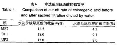 2.4 水洗對(duì)綠原酸截留率的影響 膜分離過程會(huì)產(chǎn)生濃縮液,當(dāng)濃縮液的體積小到不足以形成回流時(shí),膜分離過程就不能進(jìn)行。但是濃縮液中還含有比較高濃度的綠原酸,為了充分回收綠原酸,采用濃縮液加水稀釋以形成膜回流的水洗工藝是必要的。加與濃縮液等質(zhì)量水的水洗前后,MF2、UF1和UF2膜的綠原酸截留率見表4。由表4中數(shù)據(jù)可知,微濾、超濾的濃縮液經(jīng)過等質(zhì)量水洗后,膜對(duì)綠原酸的截留率均明顯降低了,尤其是微濾膜MF2的濃縮液經(jīng)一次等質(zhì)量水洗后綠原酸的截留率大幅度地降低。
