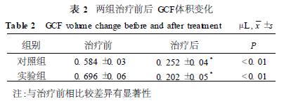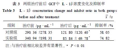 2. 2 GCF量 根據(jù)換算方程,將紙尖濕潤(rùn)長(zhǎng)度換算成體積(單位μL) ,兩組治療后GCF量比治療前 均顯著降低( P < 0. 01) ,但治療后GCF量組間比較無(wú)統(tǒng)計(jì)學(xué)意義,見(jiàn)表2。 2. 3 GCF中的IL - 1β濃度(單位: pg/mL) 兩組治療后IL - 1β濃度均較治療前有顯著下降( P <0. 05) ,大黃素藥條+齦下刮治組治療后的IL - 1β濃度下降的更明顯,其抑制率為74. 82% ,見(jiàn)表3。