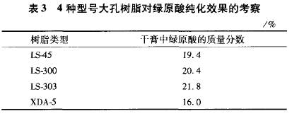 由結(jié)果可見,LS-303樹脂解吸附率較好。 2.6不同樹脂對(duì)綠原酸純化效果的考察 將解吸附率試驗(yàn)中的洗脫液在60℃濃縮、真空干燥至恒重,測(cè)定干膏中綠原酸的質(zhì)量分?jǐn)?shù),結(jié)果見表3。