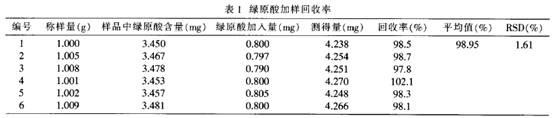 分別進(jìn)樣濃度為50ug/mL的對照品溶液1、3、5、7、9、11uL,在上面的色譜條件下進(jìn)行測定。以進(jìn)樣量(pug)為橫坐標(biāo),峰面積為縱坐標(biāo),繪制標(biāo)準(zhǔn)曲線,得到回歸方程y=2l1.36x-34.671,r=0.9998,說明綠原酸在0.05~0.551xg范圍內(nèi)有良好的線性關(guān)系。 2.2 穩(wěn)定性實(shí)驗(yàn) 將同一供試品溶液在制備后的0、4、8、12、16h.進(jìn)樣分析,測得綠原酸峰面積的RSD 值1.1% (n=5),表明樣品在16h內(nèi)具有良好的穩(wěn)定性。 2.3 精密度實(shí)驗(yàn) 將對照品溶液重復(fù)進(jìn)樣5次,每次101xL,分別測得綠原酸的峰面積, 計(jì)算RSD值為0.91% (n=5),表明儀器精密度良好。 2.4 重復(fù)性實(shí)驗(yàn) 準(zhǔn)確稱取杜仲雄花茶5份,每份1g,按照“供試品溶液制備”項(xiàng)下操作.各取101xL進(jìn)樣,測定綠原酸平均含量的RSD為1.3% ,表明方法的重復(fù)性良好。 2.5 加樣回收率實(shí)驗(yàn) 精密稱取已知含量的杜仲雄花茶各6份. 每份1g,分別加入綠原酸對照品,按“供試品溶液制備”項(xiàng)下操作,測定,計(jì)算回收率,結(jié)果見表1。