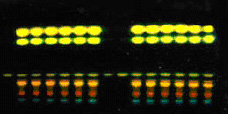 2 測定方法 2.1 供試液制備 取白果基地與綠蔥坡基地產(chǎn)樣品粉末各0.5g,精密稱定,加甲醇超聲提取3次,每次20min,濾過,濾液蒸干,殘渣加水l00ml溶解,加鹽酸l0ml,置水浴上回流30 min,立即冷卻,用乙醚提取3次,每次50ml,合并乙醚液,用水50ml洗滌,棄去水液,乙醚液小心揮干,殘渣用乙酸乙酯溶解移至l0ml量瓶中,并稀釋至刻度,搖勻,作為供試品溶液。 2.2 對照品溶液制備 取大黃素對照品,加乙酸乙酯制成每1ml含0.2mg的溶液,作為對照品溶液,吸取對照品溶液4μl,點于硅膠GF254預(yù)制板(20×10cm)上,以石油醚(30~60℃)-甲酸乙酯-甲酸(15:5:1)的上層溶液為展開劑,展開約8cm,取出,晾干。 2.3 掃描測定 取供試液2份,編號分別為1#(白果基地樣品)、2#(綠蔥坡基地樣品),各裝3份,與對照液S1、S2按S1 S2 a a a b b b Sl S2 a a a b b b順序排列(S1:對照液低濃度,S2:對照液高濃度,a:供試液1#,b:供試液2#)。吸收掃描[波長:λs=440nm,掃描速度:20mm/s,掃描時間:3min(16個掃描道)],在CAMAG全自動點樣器(Automatic TLC Sampler Ⅲ)條帶狀點樣,供試品色譜中,置紫外光燈(光源:鎢燈,365nm)下檢視,再置氨蒸氣中熏后,在與對照藥材色譜相應(yīng)的位置上,日光下檢視。 2.4 計算 以CAMAGCATS4.0掃描用計算機軟件計算,直線回歸,外標(biāo)法兩點校正,,積分時間:1 min (計算機自動積分) 回歸方程為:Y1=17410.15+3646.64X1,γ=0.9991[2]。 3 測定結(jié)果 3.1 色譜 紫外光燈下斑點變?yōu)榧t色,顯相同的六個橙黃色熒光主斑點(圖2);氨蒸氣熏后,在與對照品色譜相應(yīng)的位置上,日光下顯六個相同的紅色熒光斑點,未顯持久的亮紫色熒光(圖3)   圖2: 365nm熒光色譜 圖3:氨熏后可見光色譜 3.2 大黃素含量測定 所取兩份樣品在 105℃干燥恒重后,減失重量分別為13.7%和14.1%,總灰份分別為8.9%和9.2%,酸不溶性灰份分別為7.1%和6.8%,均未超過《中國藥典》所規(guī)定的干燥后減失重量<15.0%,規(guī)定的總灰分<10.0%,酸不溶性灰分<0.8%。大黃素含量詳見表1。