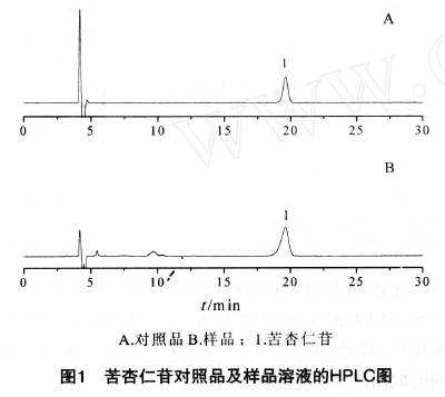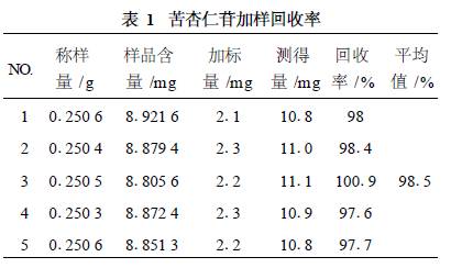 苦杏仁苷在0. 03~1. 00 mg·mL - 1范圍內(nèi)呈現(xiàn)良好的線性關(guān)系. 2. 1. 5 精密度試驗 以質(zhì)量濃度為0. 5 mg·mL - 1的對照品溶液為考察對象,在上述色譜條件下連續(xù)進樣5次,測得苦杏仁苷峰面積的RSD為2. 08% ,表明本法精密度良好. 2. 1. 6 重復性試驗 取苦杏仁樣品按供試品溶液制備方法平行制備5份, 進樣分析. 測得苦杏仁苷峰面積的RSD 為2. 80% ,表明方法重復性良好. 2. 1. 7 穩(wěn)定性試驗 取苦杏仁供試品溶液,室溫放置,在擬定色譜條件下于0, 2, 4, 6, 8 h分別進樣,測得峰面積的RSD為2. 96% ,表明供試品溶液中苦杏仁苷在8 h內(nèi)穩(wěn)定性良好. 2. 1. 8 加樣回收率試驗 取已知苦杏仁苷含量的苦杏仁粉末5 份,各0. 25 g精密稱定,分別精密加入苦杏仁苷對照品適量,按供試品溶液制備方法制備,在擬定色譜條件下進行測定,計算,得苦杏仁苷的平均加樣回收率為98. 5% , RSD為2. 50% ,表明該測定方法測定結(jié)果準確. 結(jié)果見表1.